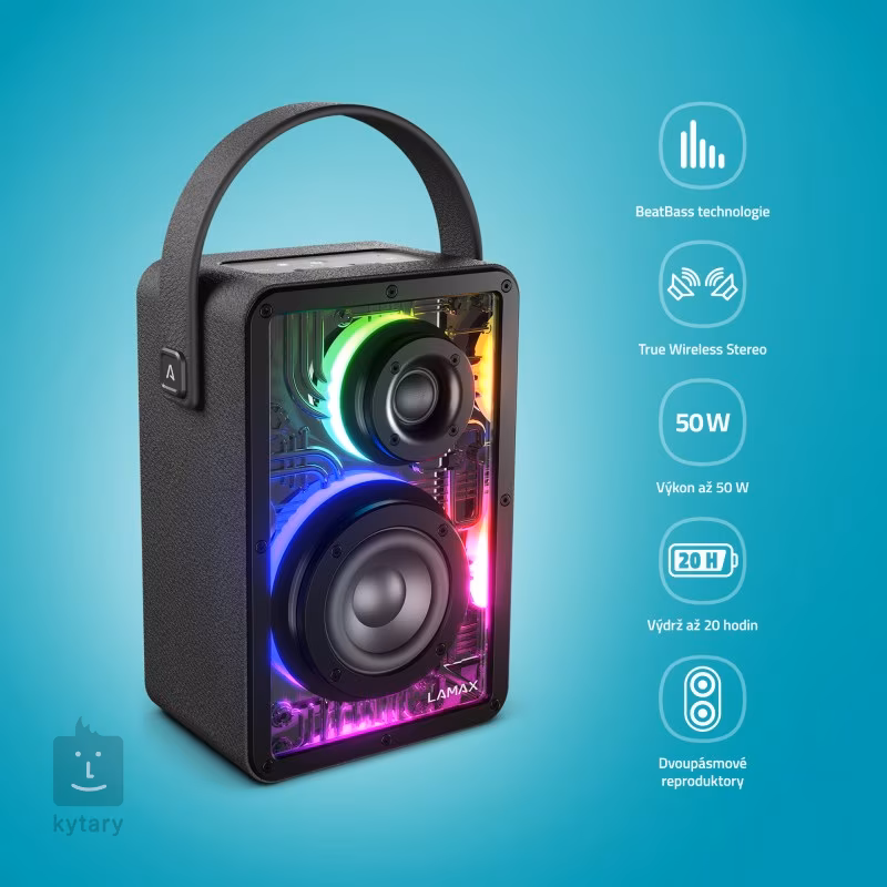 Prostřednictvím technologie BeatBass si užijete mohutné basy, zatímco výkonná baterie zajistí až 20 hodin nepřetržité hudby. Díky voděodolnosti IPX5 se nemusíte bát ani deště či stříkající vody, takže skvělá atmoška u bazénu je zajištěna. Stylové LED osvětlení, které mění barvy, přidá každé akci vizuální efekty a moderní Bluetooth 5.3 zaručuje stabilní spojení a snadné ovládání na dosah ruky. Samozřejmostí je i podpora párování dvou reproboxů (TWS) pro klasický stereo poslech.