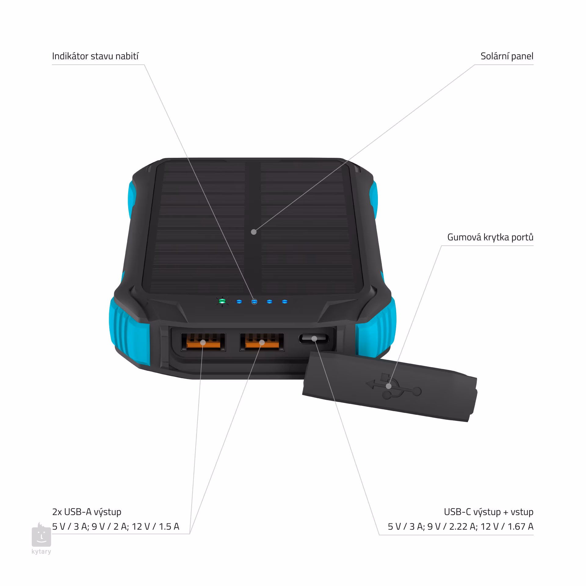 Powerbanka je schopná dobíjet až tři zařízení najednou, zároveň nabízí i čtyři režimy svítilny s osmnácti LED - silné a slabé svícení, SOS a rychlé blikání. Výletníky i vyložené dobrodruhy potěší voděodolné tělo s odolnou pogumovanou konstrukcí, která powerbance zajišťuje bezpečí. Při výletě na sluníčku si powerbanka vypomůže solárním panelem - stačí ji tak položit k oknu nebo zavěsit karabinou na batoh a energie ze slunce ji udrží nabitou.