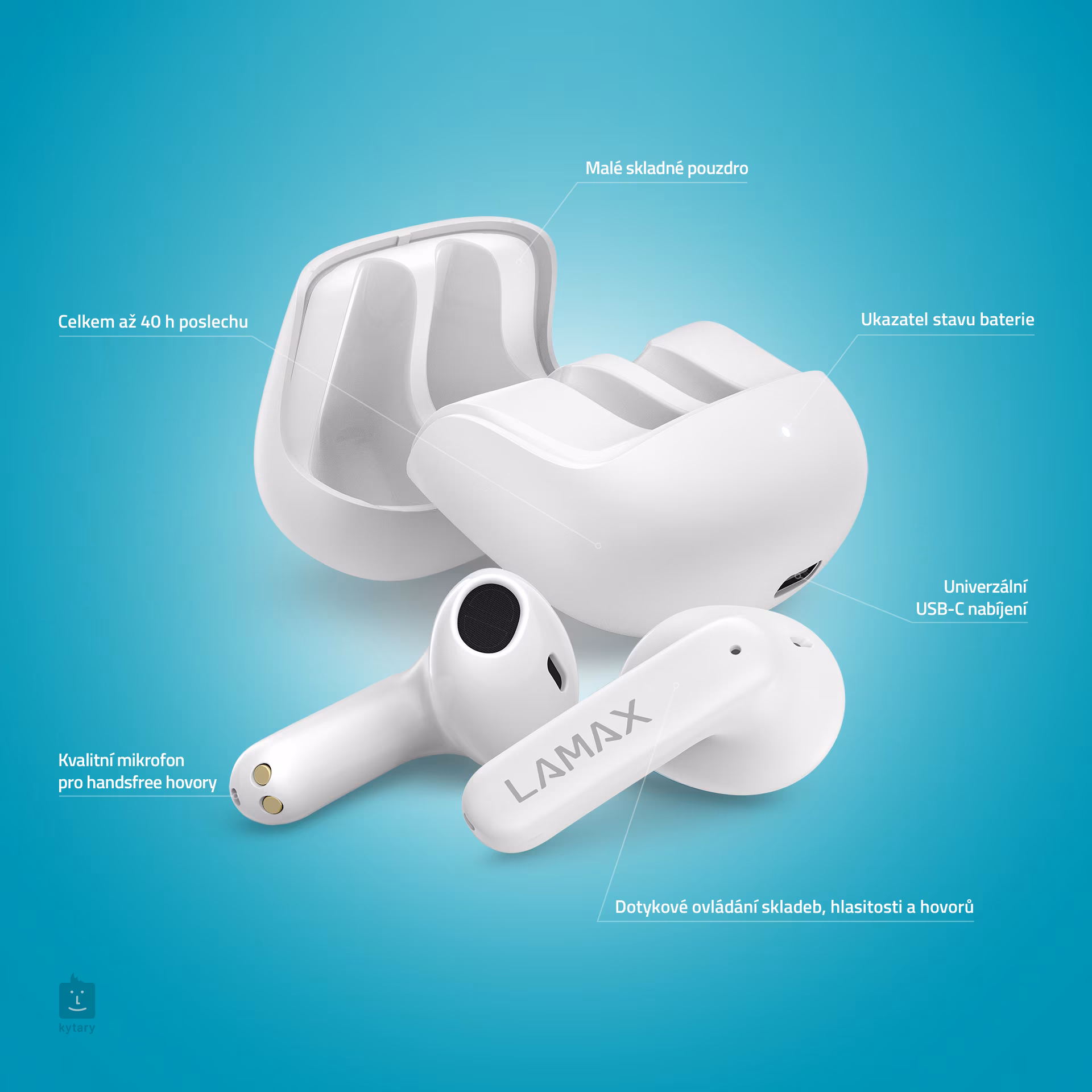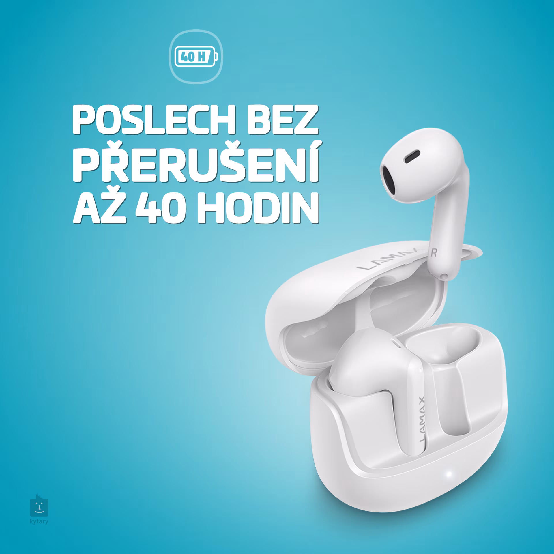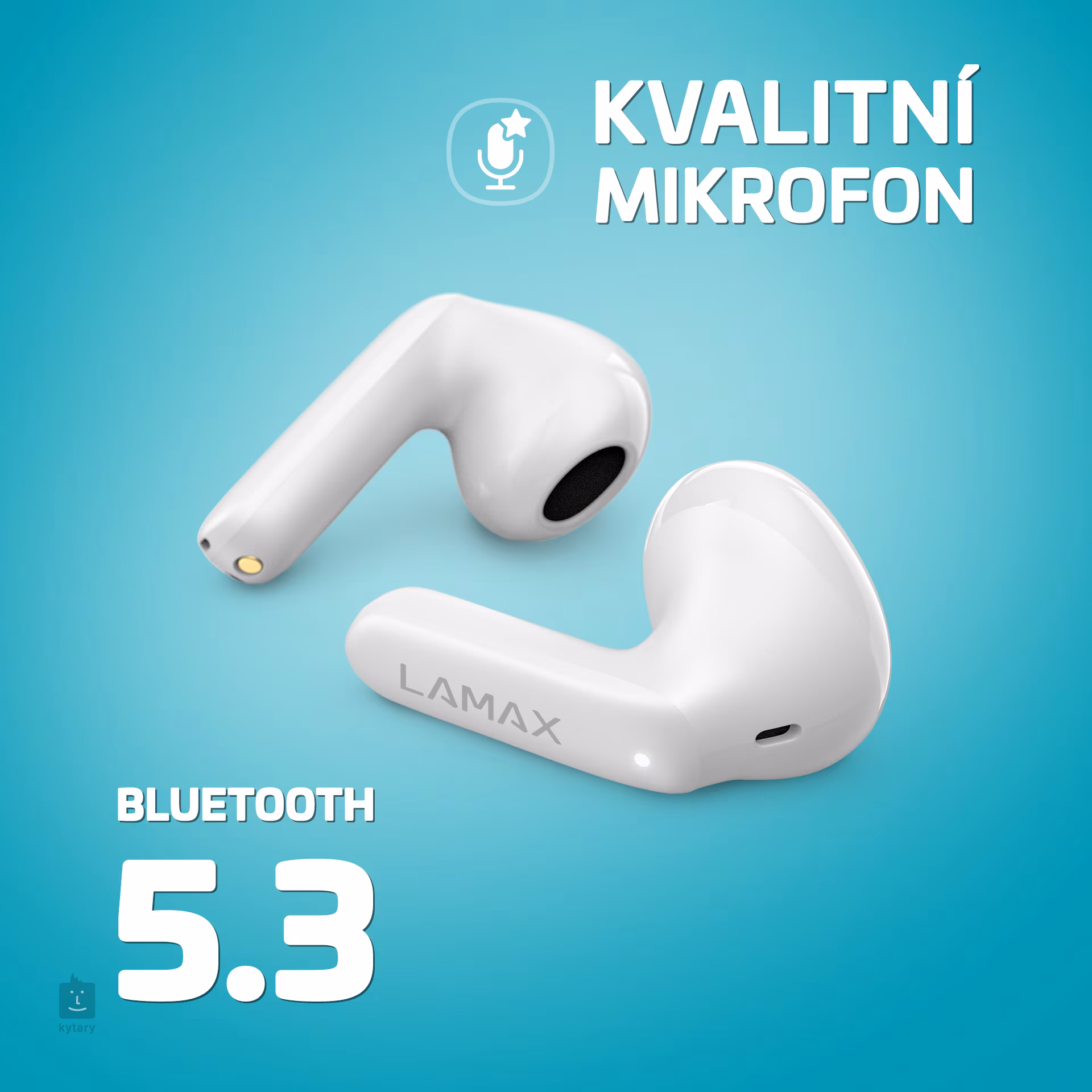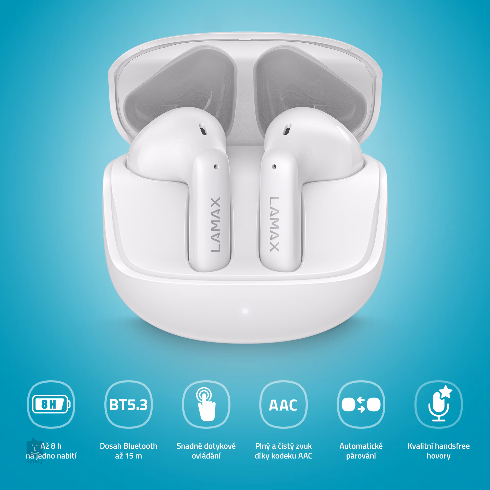 Bezdrátová in-ear sluchátka LAMAX Tones1 s rychlým Bluetooth 5.3 připojením a dosahem až 15 metrů vám poskytnou svobodu pohybu a poslechu až na osm hodin na jedno nabití a dalších 32 hodin s nabíjecím pouzdrem. Užijte si parádní zvuk kdykoli a kdekoli.
