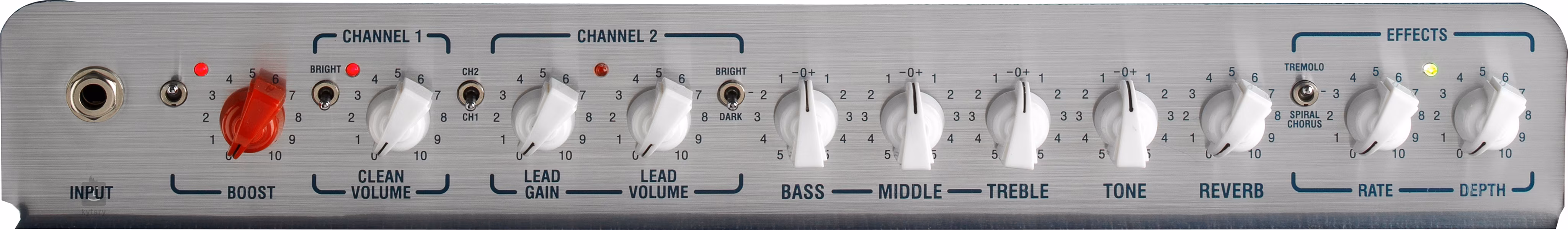 Boost, Clean Volume, Lead Gain, Lead Volume, Bass, Middle, Treble, Tone, Reverb, Rate, Depth, switches: Boost, Bright, CH1/2, Bright/Natural/Dark, Tremolo/Spiral Chorus