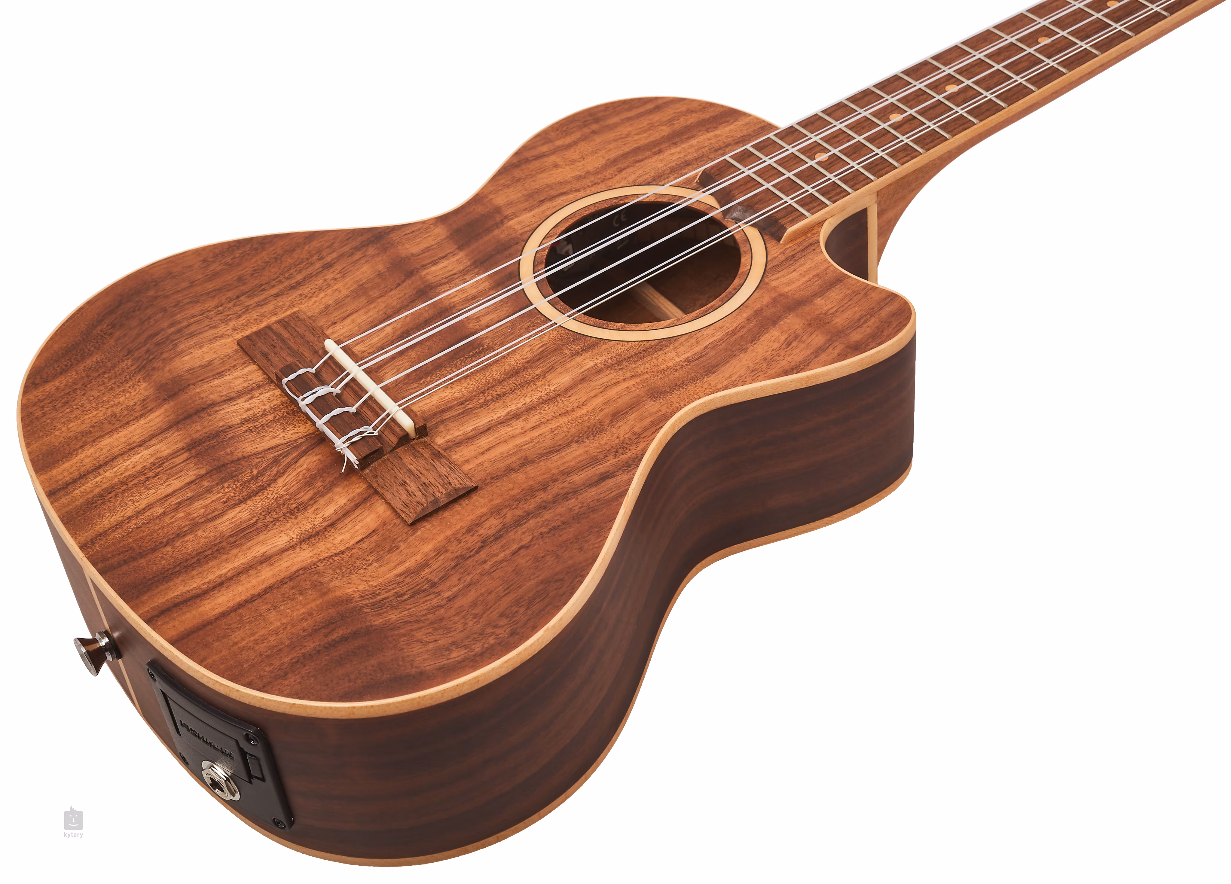 Přední deska tohoto šestistrunného tenorového ukulele je zhotovena z masivního dřeva akácie. Šest strun poskytuje nástroji výraznější, plnější, tón. Hmatník z ořechu je osazen sedmnácti pražci, orientaci usnadňují poziční značky. Širší krk nástroje a nultý pražec nabízí pohodlný dohmat a pohyb na hmatníku, nultý pražec a sedlo z materiálu NuBone XB poskytují strunám dobrý sustain. Stabilitu ladění zaručují kvalitní klasické otevřené chromované mechaniky. Vizuální dojem podtrhuje rozeta a lemovka (těla a hmatníku) z javoru. Ukulele je dodáváno s obalem (gig bag) o tloušťce polstrování 10 mm.