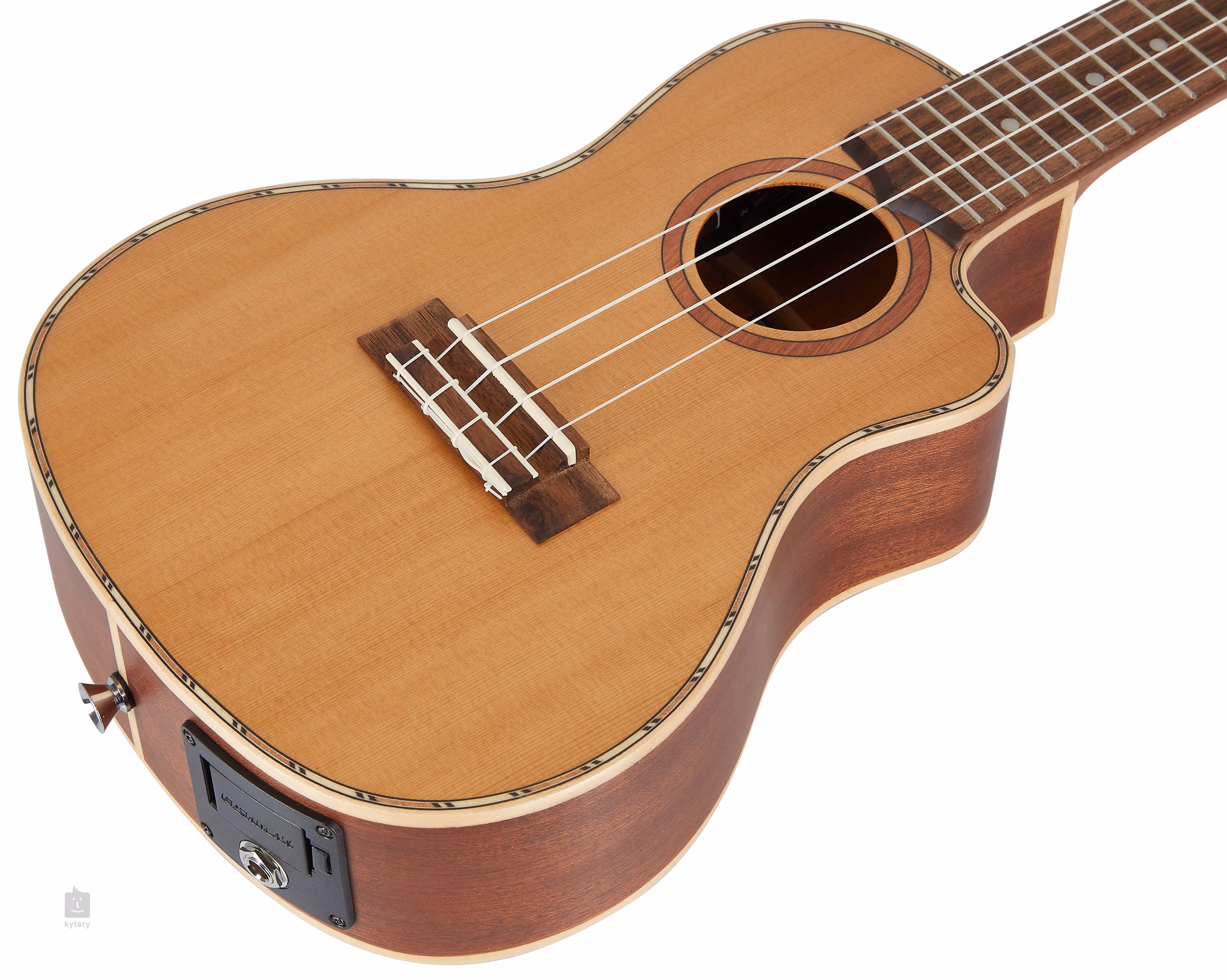 Přední deska tohoto elektroakustického koncertního ukulele je zhotovena z masivního cedru, který na lubech a zadní desce doplňuje vrstvený mahagon. Plochu ořechového hmatníku rozděluje osmnáct pražců, orientaci po jeho ploše usnadňují poziční značky. Širší krk nástroje a nultý pražec nabízí pohodlný dohmat a pohyb na hmatníku, nultý pražec a sedlo z materiálu NuBone XB poskytují strunám dobrý sustain. Stabilitu ladění zaručují kvalitní otevřené chromované mechaniky značky Grover. Pěkné zpracování podtrhuje javorová lemovka doplněná zdobnou dřevěnou výložkou. Ukulele je dodáváno s obalem (gig bag) o tloušťce polstrování 10 mm.