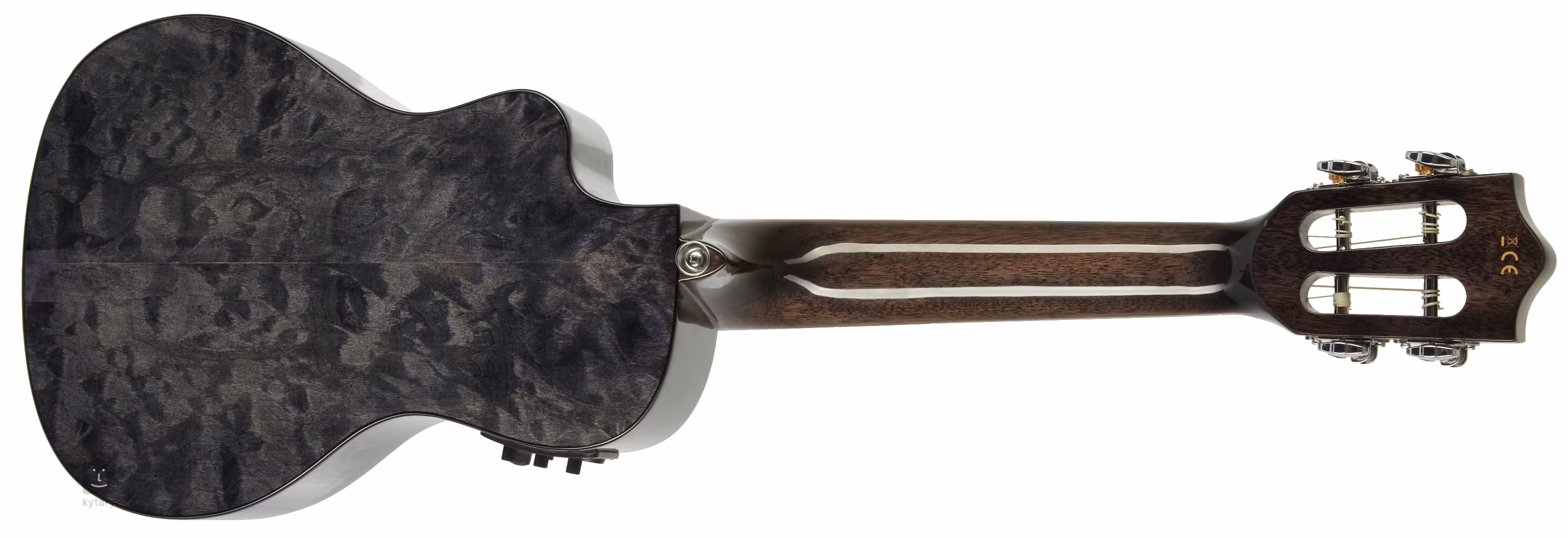 Některé nástroje vás osloví až při hře, jiné na vás už mávají z dálky – tak jako v případě tohoto koncertního ukulele. Působivou kresbu dřeva obláčkového javoru použitého na korpus nástroje zdobí mořená úprava Black Stain. Hmatník z ořechu je osazen osmnácti pražci, orientaci usnadňují poziční značky. Širší krk nástroje a nultý pražec nabízí pohodlný dohmat a pohyb na hmatníku, nultý pražec a sedlo z materiálu NuBone XB poskytují strunám dobrý sustain. Stabilitu ladění zaručují kvalitní otevřené chromované mechaniky Grover Deluxe. Vizuální dojem podtrhuje perleťová rozeta. Ukulele je dodáváno v kvalitním softcase s vnitřní pěnovou vycpávkou.