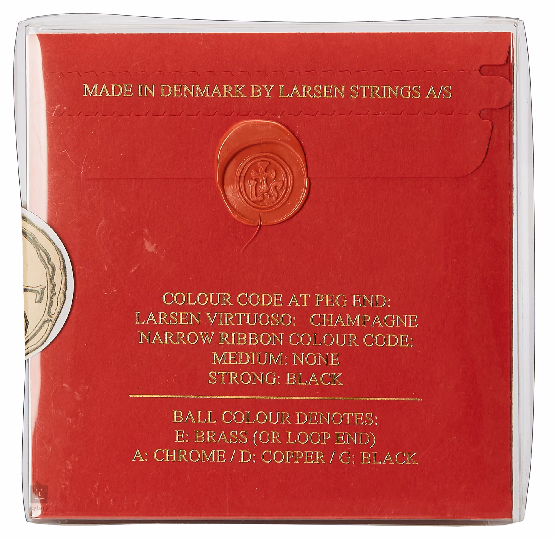 Houslová sada strun Larsen Virtuoso špičkového dánského výrobce. Jádro strun je tvořeno lankem ze syntetického materiálu. Oproti sadě Tzigane, nabízí měkčí dohmat při zachování silného a vyrovnaného zvuku s výraznějšími alikvótními tóny. Syntetické struny velmi málo reagují na teplotní a vlhkostní změny, což jim zaručuje dobrou stabilitu ladění.