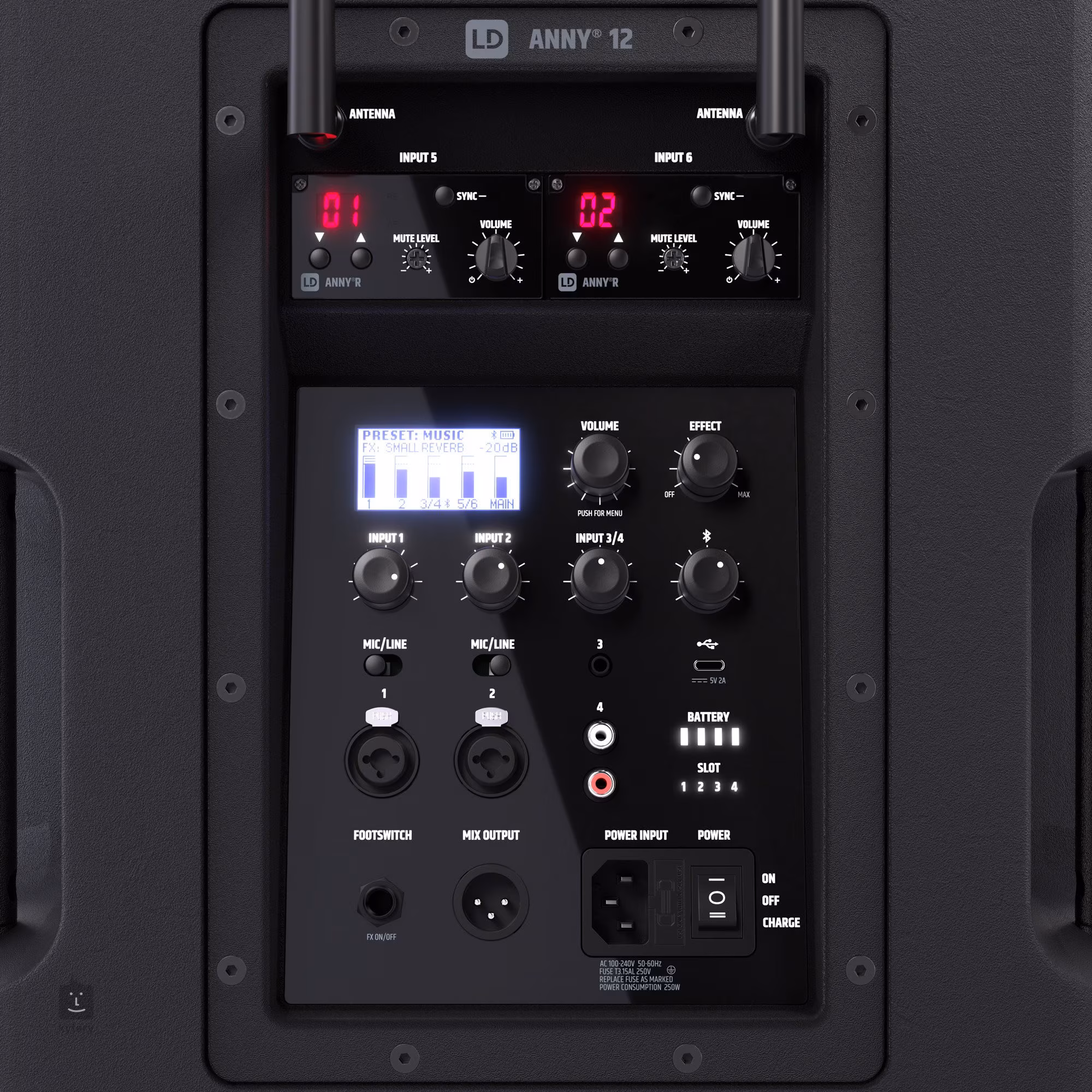2x Combo XLR/Jack 6.3 mm (mic/line), 1x Jack 6.3 mm, 2x RCA, 1x Footswitch, Bluetooth
