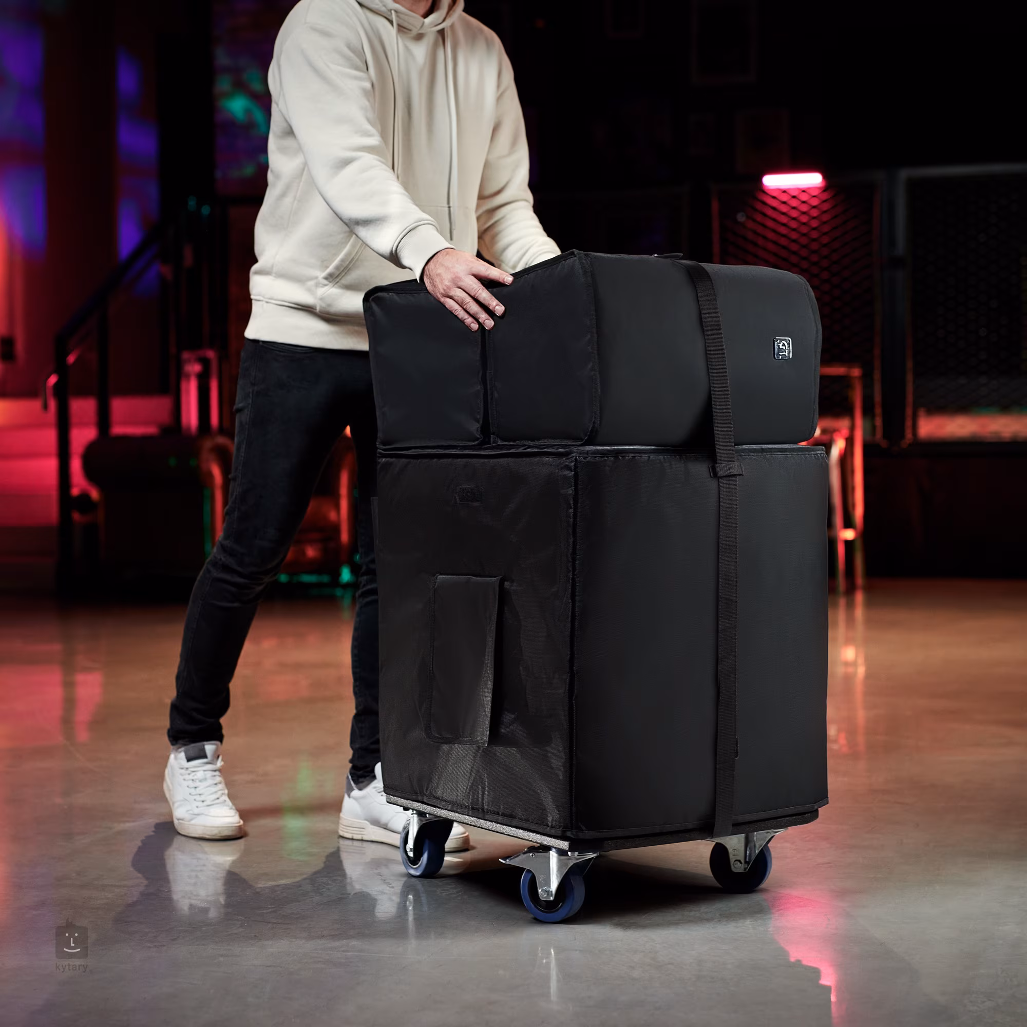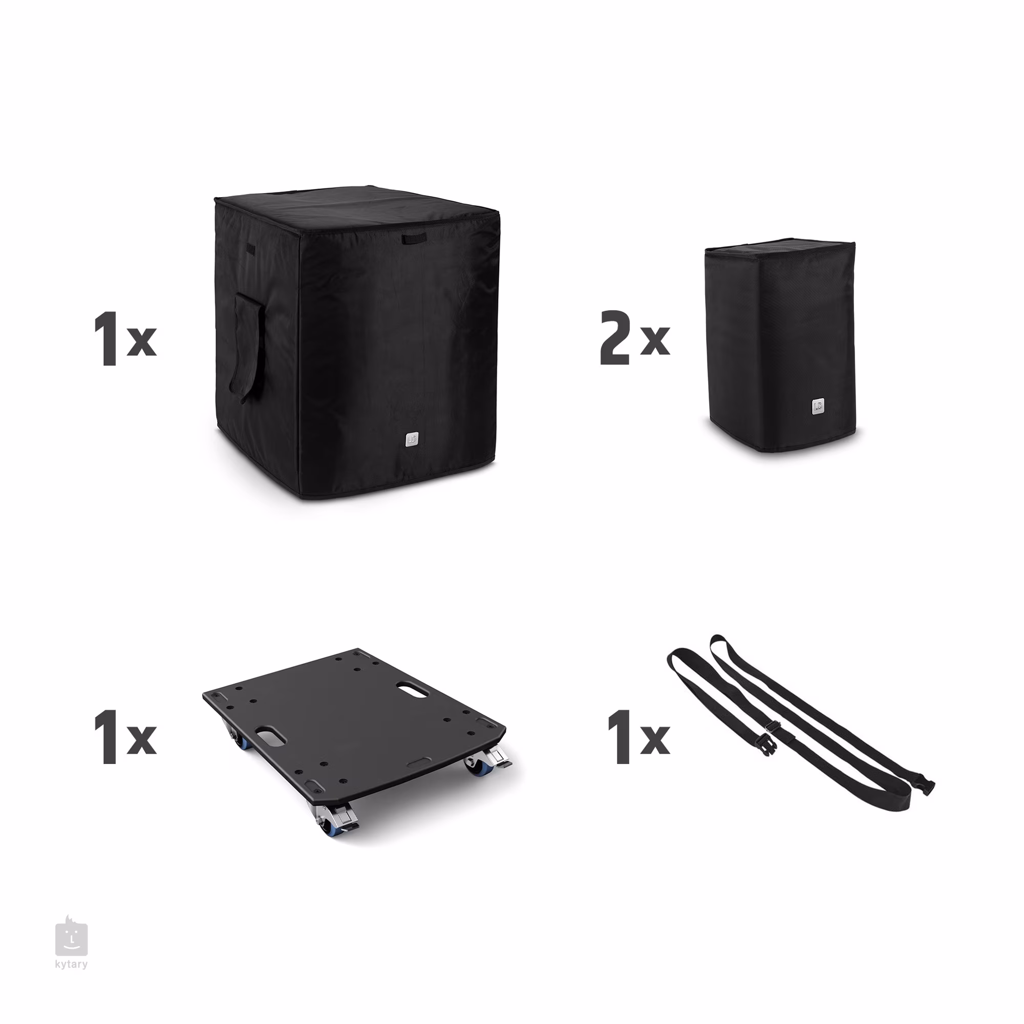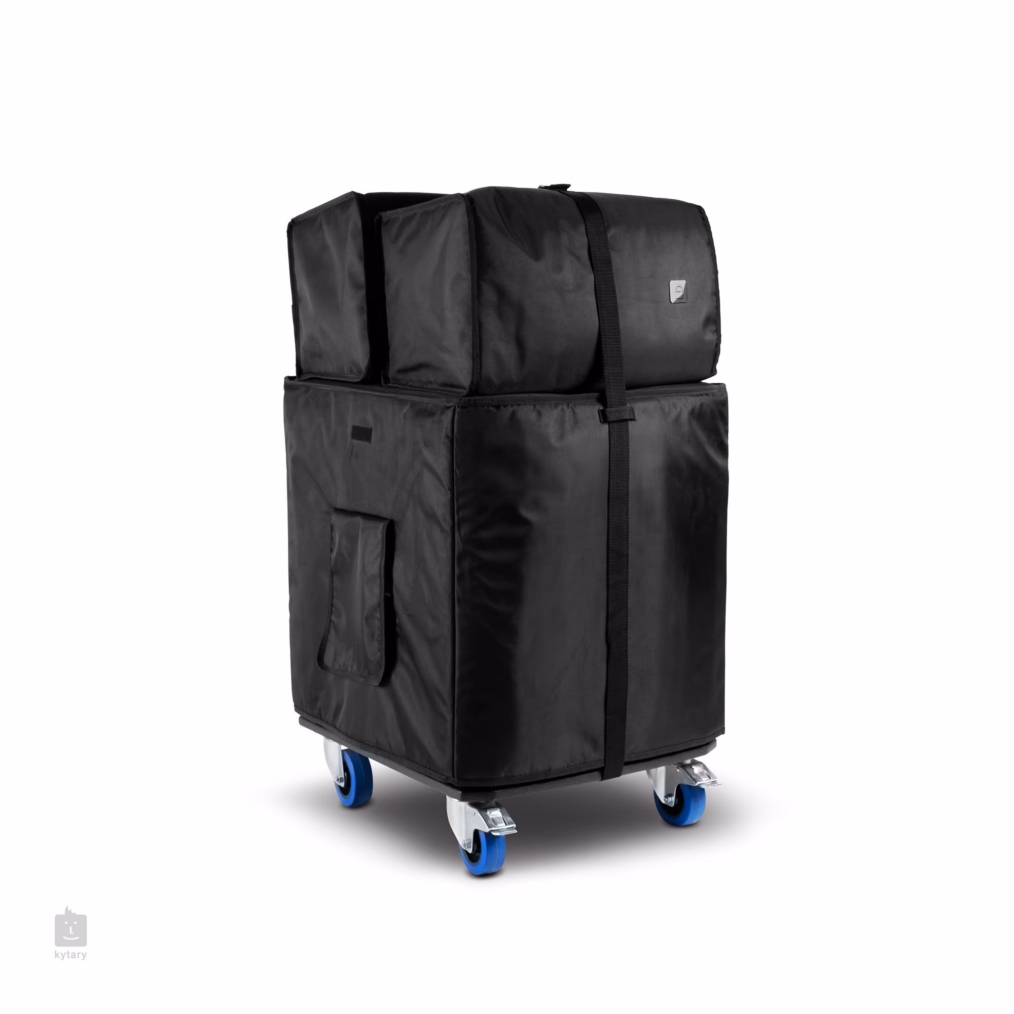 Set polstrovaných přepravních obalů pro kompletní ozvučovací systém LD Systems DAVE 15 G4X. Set obsahuje plošinu s kolečky zhotovenou z 18 mm silné březové překližky kryté polyuretanovým nátěrem, obal na subwoofer s vnější kapsou na drobné příslušenství, dva obaly na satelity a popruh. Kolečka mají průměr 80 mm, dvě z nich mají brzdy.