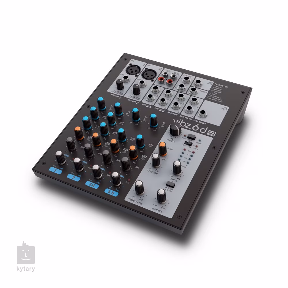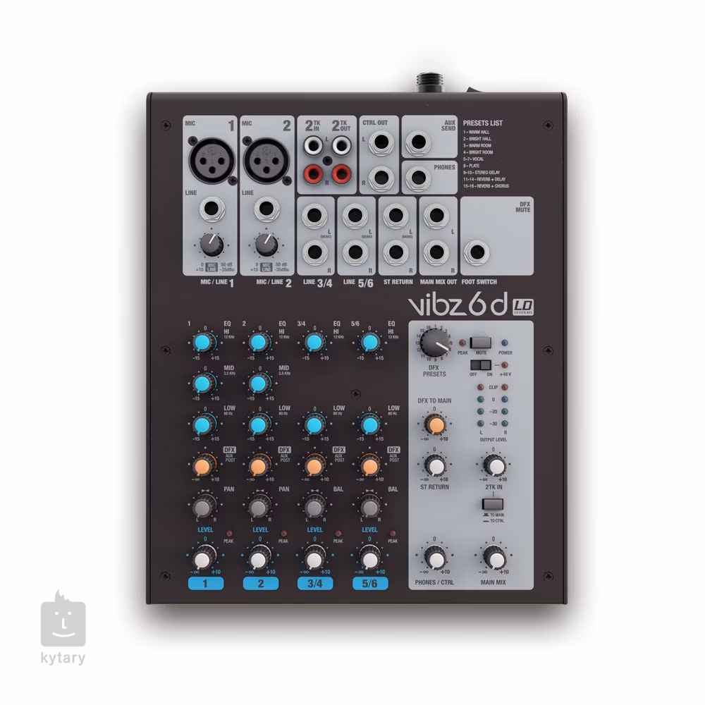 VIBZ 6 se se svými šesti kanály a snadným ovládáním výborně hodí pro menší hudební tělesa nebo zvučení malých akcí. Dva kanály mají mikrofonní vstupy s kvalitními předzesilovači a třípásmovými korekcemi, kanál ? a 5/6 fungují jako stereo/mono linkové vstupy a jejich zvuk lze dobarvit pomocí dvoupásmových korekcí.