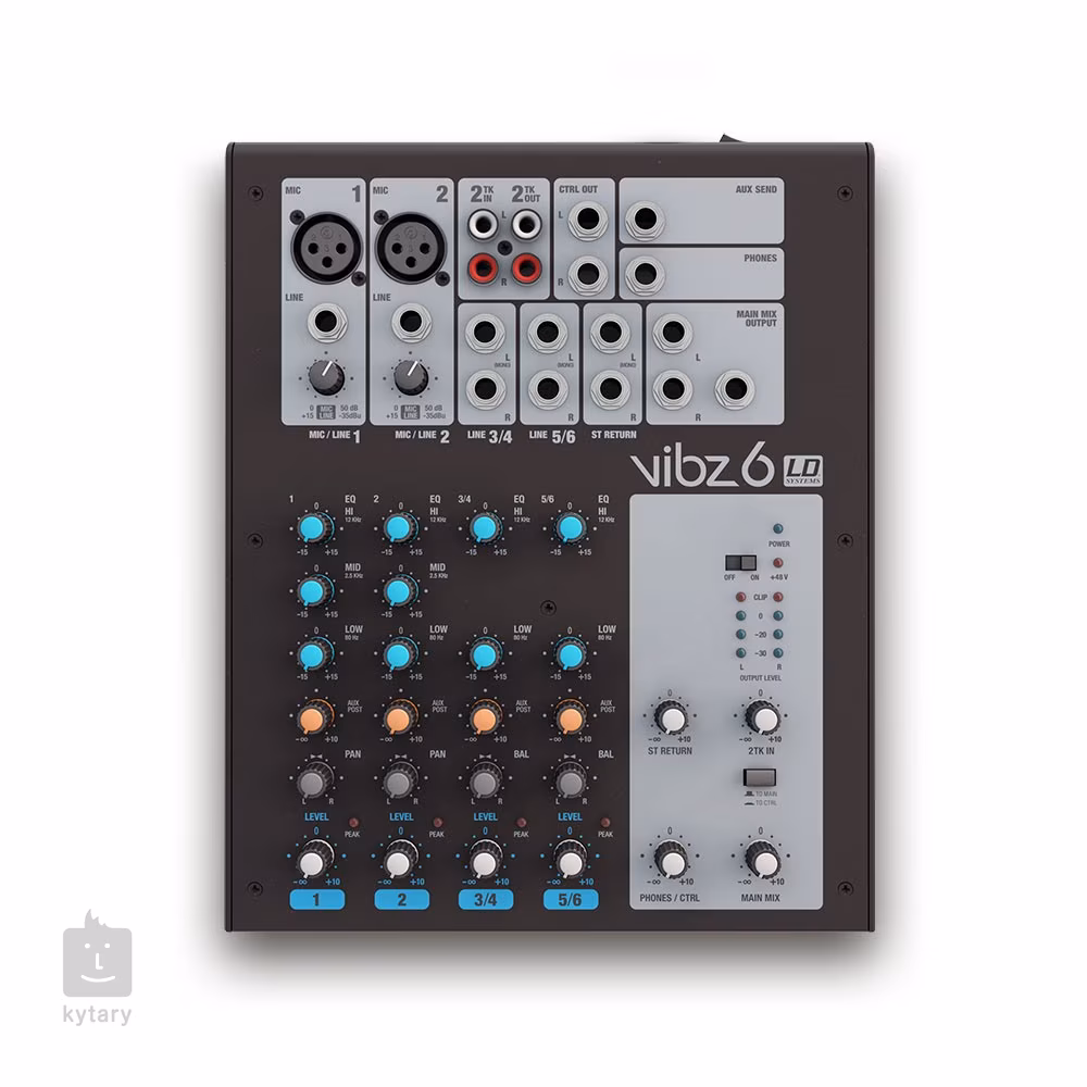 VIBZ 6 se se svými šesti kanály a snadným ovládáním výborně hodí pro menší hudební tělesa nebo zvučení malých akcí. Dva kanály mají mikrofonní vstupy s kvalitními předzesilovači a třípásmovými korekcemi, kanál ? a 5/6 fungují jako stereo/mono linkové vstupy a jejich zvuk lze dobarvit pomocí dvoupásmových korekcí.