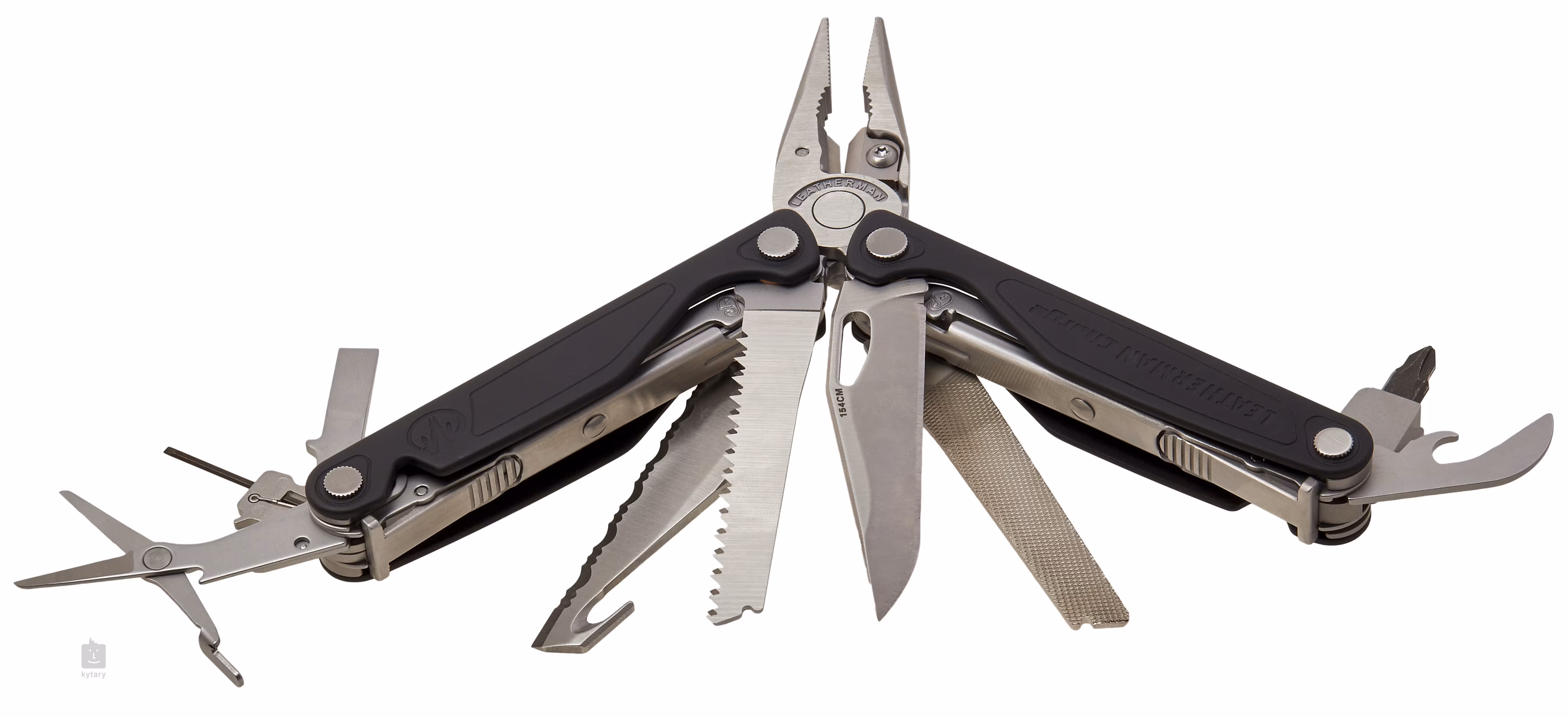 Kompletní seznam nástrojů Kleště s jehlovou špičkou Klasické kleště Vyměnitelné štípačky na dráty Vyměnitelné štípačky na tvrdé dráty Kleště na elektrické konektory Odizolovač drátů Nůž z oceli 154CM Vroubkovaný nůž z oceli 420HC Pila Pružinové nůžky Řezací hák Pravítko (19 cm) Otvírák na konzervy Otvírák na lahve Pilník na dřevo/kov Pilník s diamantovým povrchem Velký bitový nástavec Malý bitový nástavec Střední šroubovák