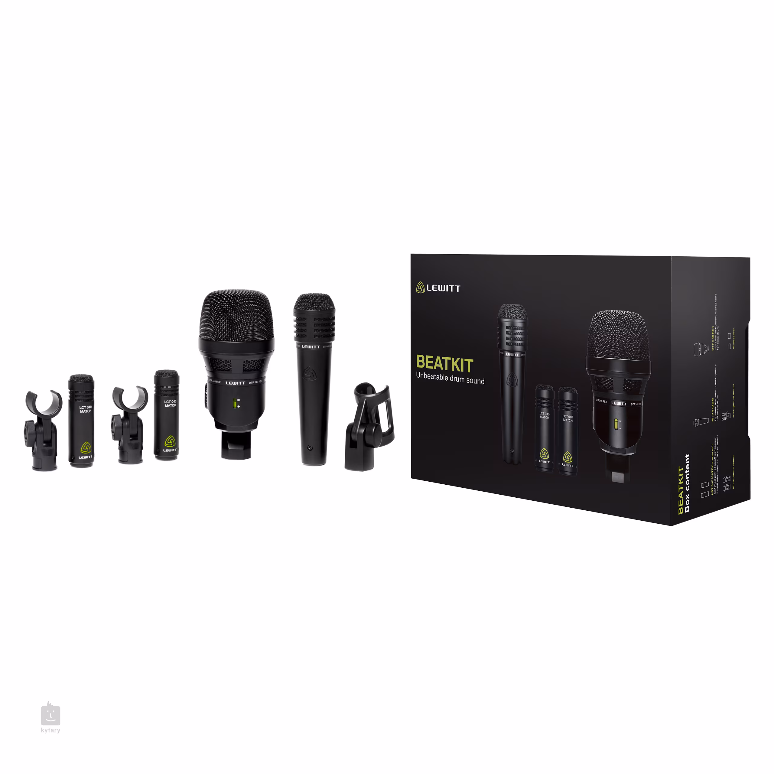 Sada čtyř mikrofonů Lewitt BEATKIT je vhodná pro ozvučení bicí soupravy v nahrávacím studiu nebo při živém vystoupení. Sada obsahuje DTP 340 REX pro basový buben, MTP 440 DM pro snare bubínek a stereo pár LCT 040 MATCH pro nahrávání overhead. Součástí balení jsou také tři mikrofonní držáky, dva protivětrné kryty pro tužkové mikrofony a robustní kufřík pro bezpečný transport.