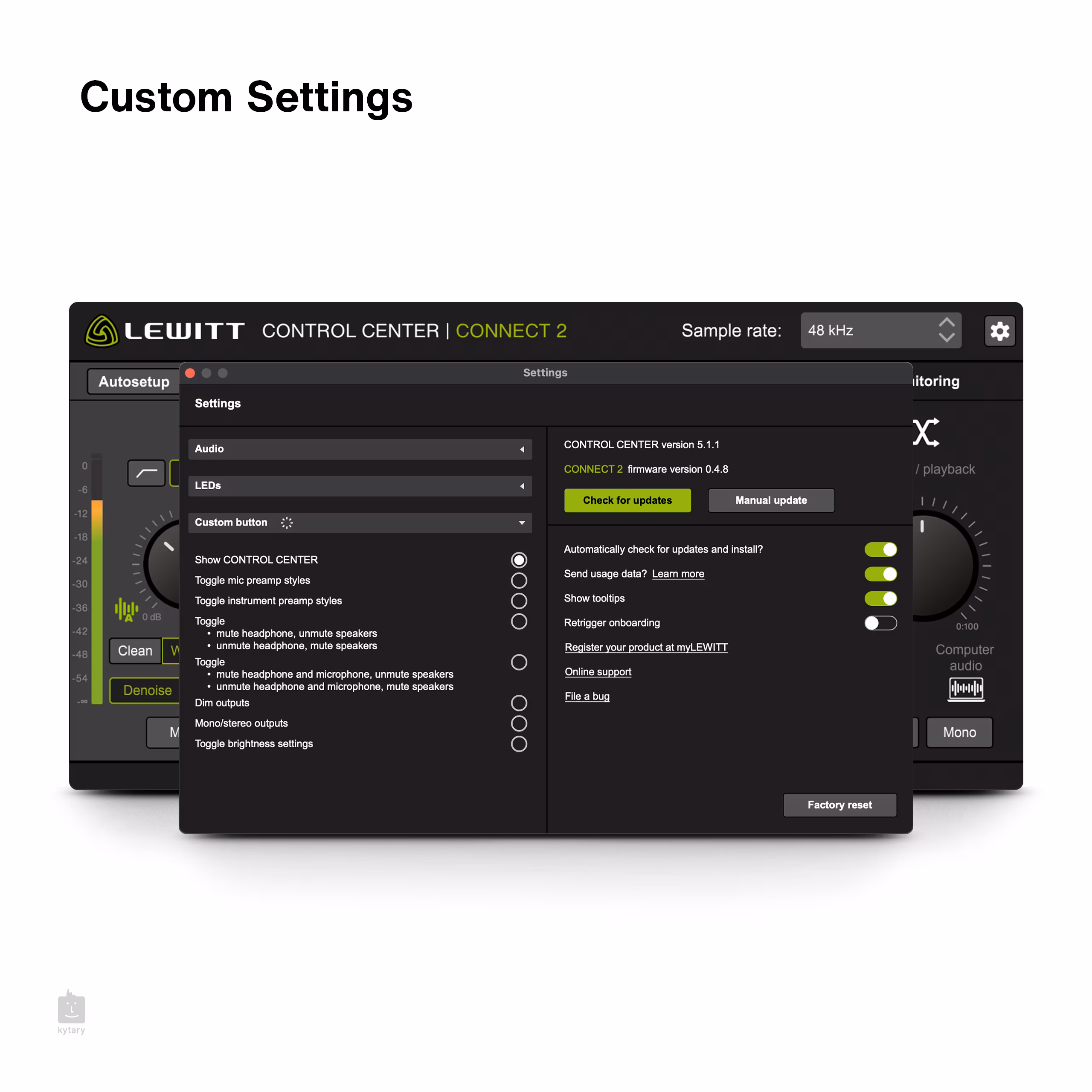 Lewitt CONNECT 2 je kompaktní USB-C zvuková karta, která je velmi uživatelsky přívětivá a poslouží i těm, kteří s nahráváním teprve začínají. Nabízí intuitivní dotykové ovládání a přehledné virtuální řídící centrum Control Center, v němž se snadno zorientujete. Neztrácejte čas zdlouhavým procesem nastavení. Stačí pár kliků a funkce Autosetup nastaví optimální parametry za vás – s pomocí Clipguardu, Denoiseru a Compressoru ochrání vaši nahrávku před přebuzením a nežádoucím šumem z okolí, takže během pár okamžiků získáte čistý a vyvážený zvuk.