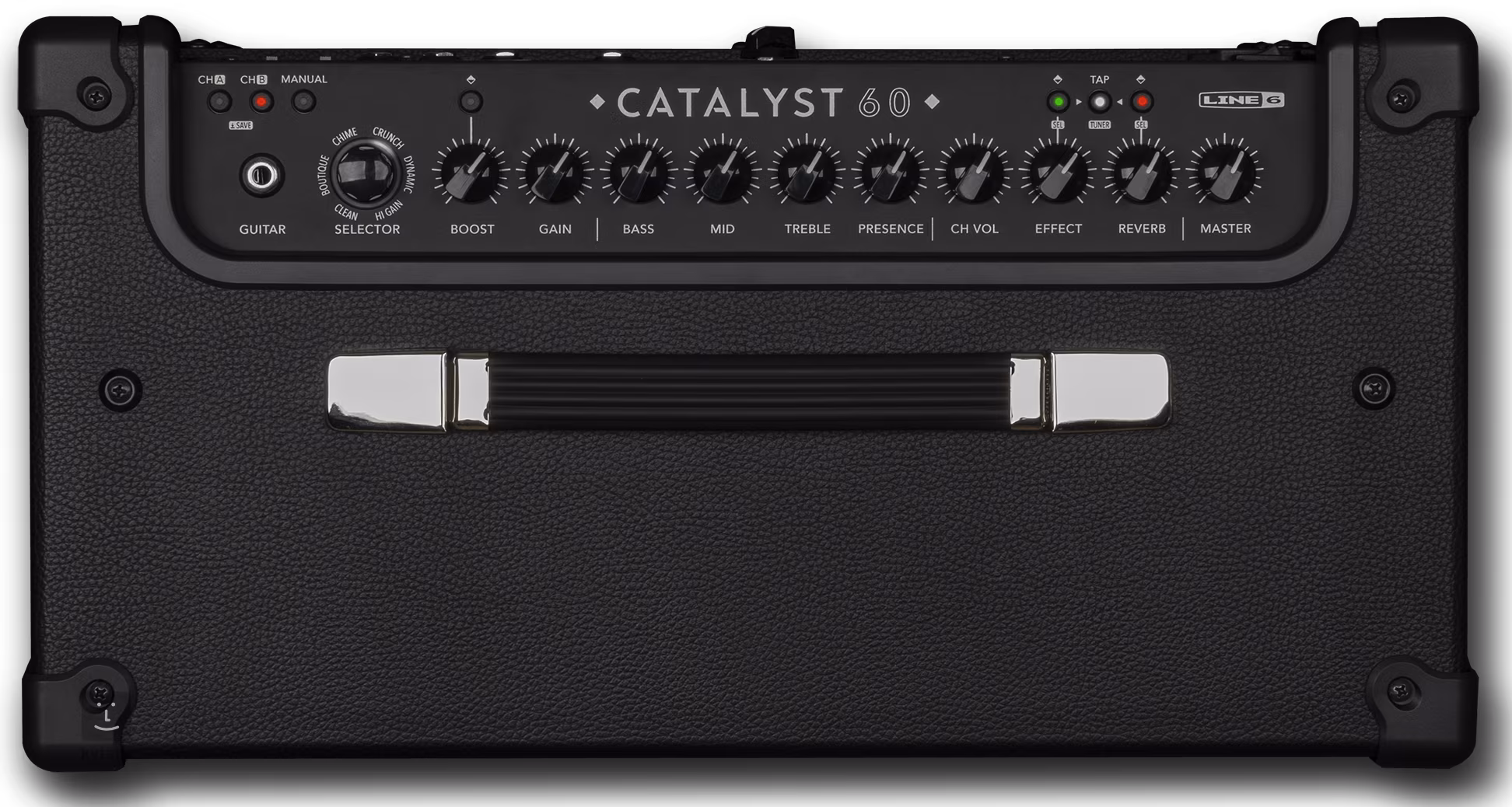Catalyst 60 je kytarové kombo s maximálním výkonem 60 wattů a možností atenuace na polovinu (30W), pokojovou hlasitost (0,5W) nebo úplného utlumení. Kombo tak obstojí na klubových prknech, ve zkušebně i ve studiu. V rámci kanálů můžete volit z šesti původních designů aparátů/modelingů založených na technologii HX - nabízí kompletní škálu kytarových zvuků od čistých přes chime/crunch po hi-gain. Charakter tónu upravíte pomocí třípásmového ekvalizéru a ovladače Presence, nastavením ovladače Boost určíte míru zesílení/nakopnutí. Pozadu není ani efektový procesor komba se šesti efekty typu reverb a dalšími osmnácti efekty typu delay, modulation a pitch. Standardem je funkce tap tempo a vestavěná ladička.