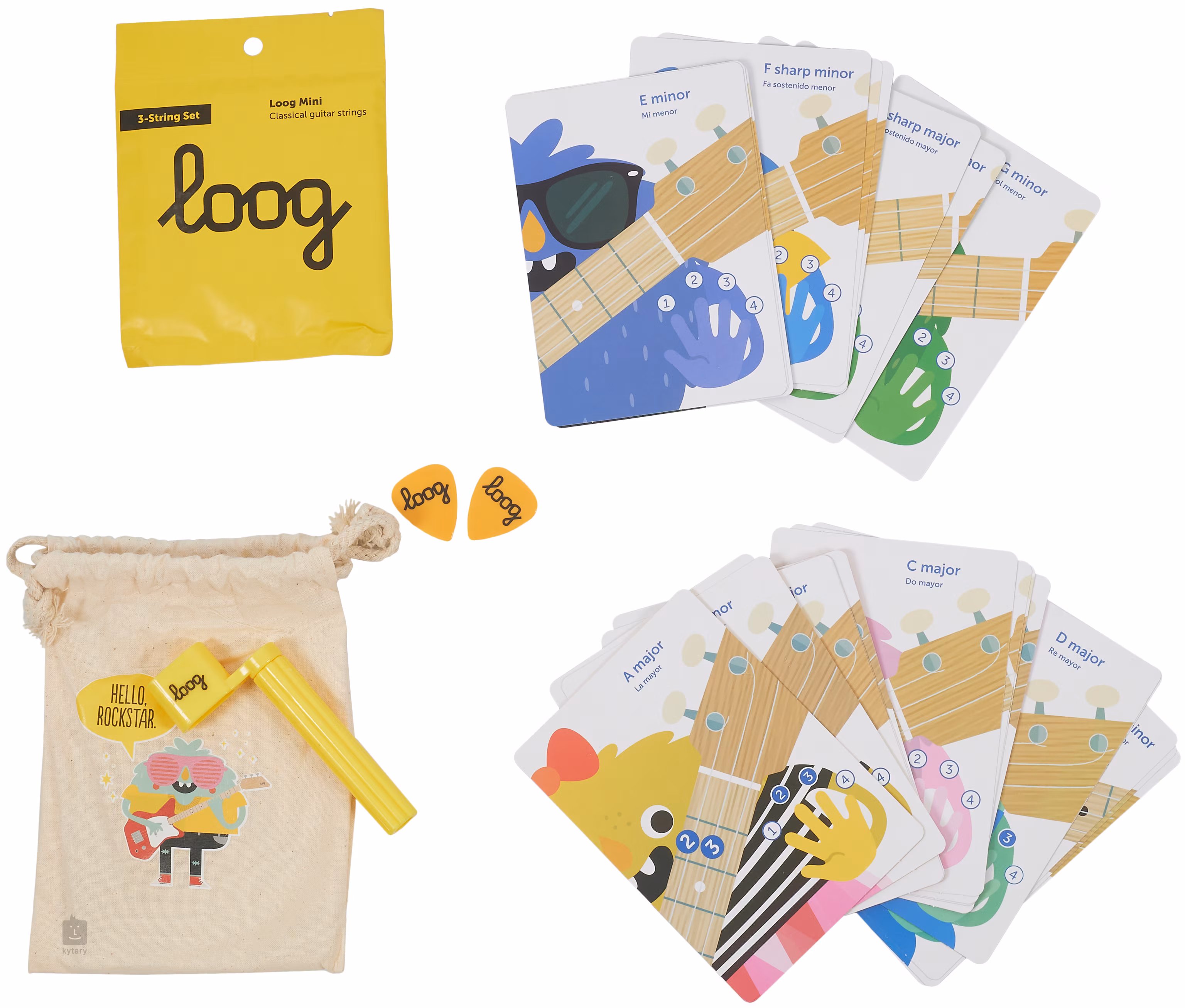 Součástí balení jsou kartičky s akordy, trsátka, set náhradních strun a odkaz na stažení volně dostupné aplikace Loog Guitar app, která vám zpřístupní video lekce, ladičku a digitální zpěvníček. Vaše děti se tak naučí písničky od Beatles, Stones, Taylor Swift a dalších umělců ve zjednodušené úpravě pro třístrunnou dětskou kytaru.