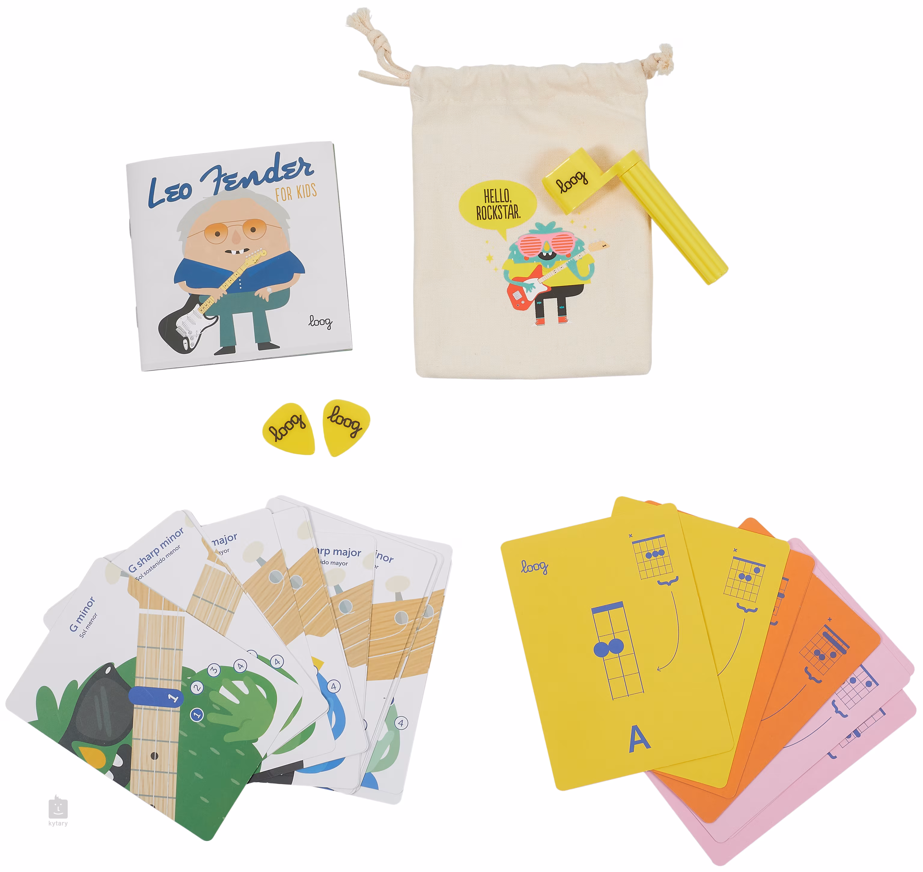 Součástí balení jsou kartičky s akordy a užitečnými tipy, trsátka, booklet “Leo Fender for kids” a odkaz na stažení volně dostupné aplikace Loog Guitar app, která vám zpřístupní video lekce, ladičku a digitální zpěvníček. Vaše děti se tak naučí písničky od Beatles, Stones, Taylor Swift a dalších umělců ve zjednodušené úpravě pro třístrunnou dětskou kytaru.