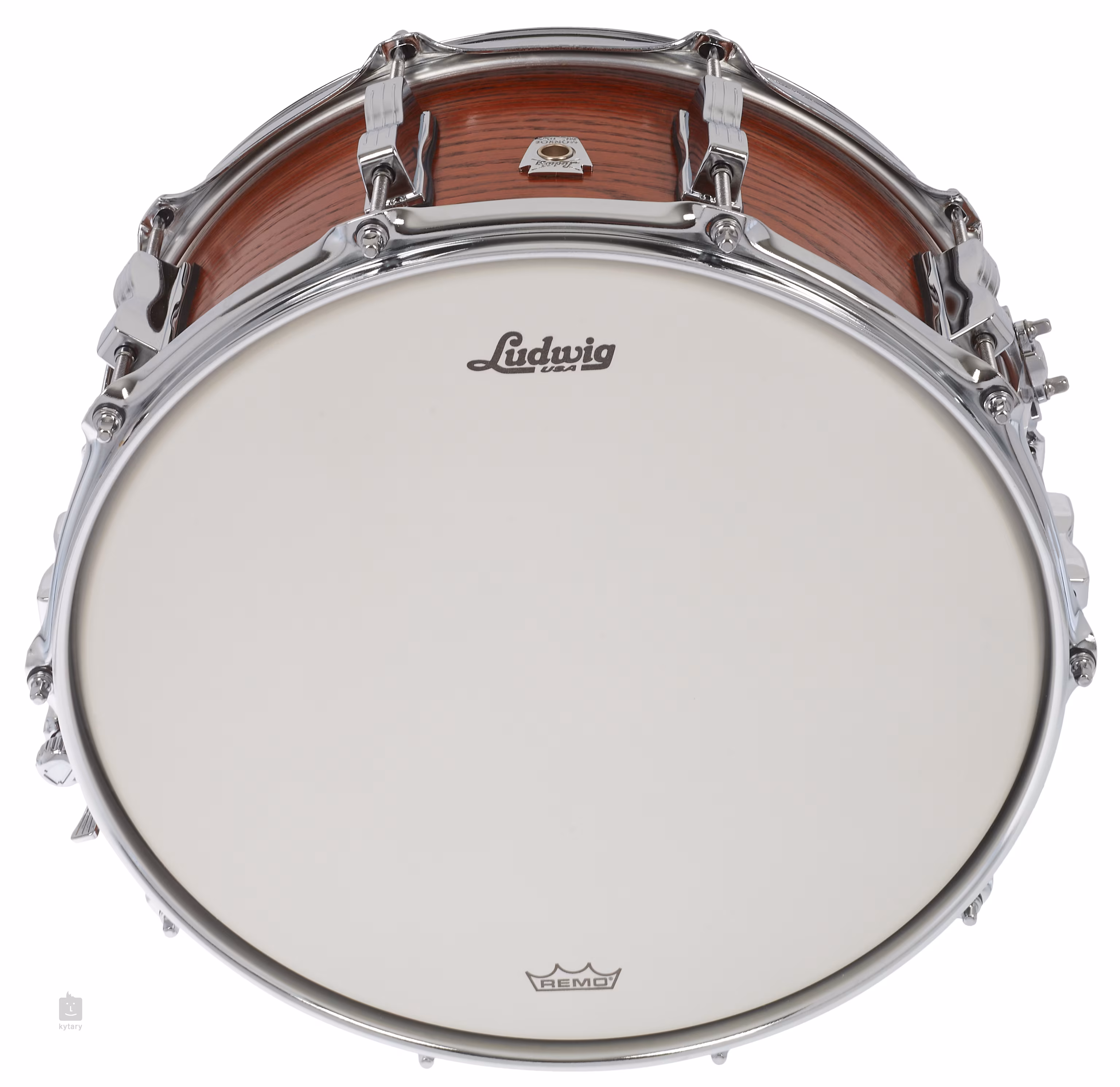 Ludwig 14" x 6,5" Classic Oak Tennessee Whiskey nabízí korpus zhotovený z pěti vrstev dřeva javoru a dubu o celkové tloušťce 6,5 mm, finiš korpusu Tennessee Whiskey, třikrát ohýbané ocelové obruče, mechaniku strunění Ludwig P88AC, deset mušlí (Classic lugs), chromovaný hardware a blány Remo s logem Ludwig.