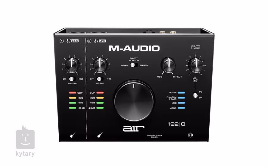 M-Audio AIR 192/8 192/8 je kompaktní dvoukanálová zvuková karta nabízející zvukový záznam o kvalitě 192kHz/24 bit a je vhodná pro detailní monitoring při nahrávání nebo postprodukci vašich nahrávek. Přední panel disponuje dvěma nástrojovými vstupy pro připojení kytar, baskytar nebo klávesových nástrojů, dále zde naleznete sluchátkový výstup pro práci v době nočního klidu a spínáč fantomového napájení pro oba kanály. Horní ovládací panel vám potom nabídne dva potenciometry Gain pro vstupní signál, USB/Direct knob pro mix vstupního signálu, robustní Main Volume, přepínač Mono/Stereo signálu pro výstup a ovladač hlasitosti sluchátkového výstupu. Čtyřúrovňová LED stupnice vám potom poskytne detailní přehled o hlasitosti vstupního signálu. Zadní strana vám nabídne stereo výstup pro studiové monitory nebo mix pult, dva páry RCA výstupů pro studiové monitory a DJ kontroléry, dva kombinované vstupy pro mikrofon nebo další hudební zařízení, MIDI In/Out a ultra rychlý USB (C) port pro PC nebo laptop. Součástí balení jsou dva USB kabely, dvě redukce na 5 pin MIDI konektor a balíček se softwary.