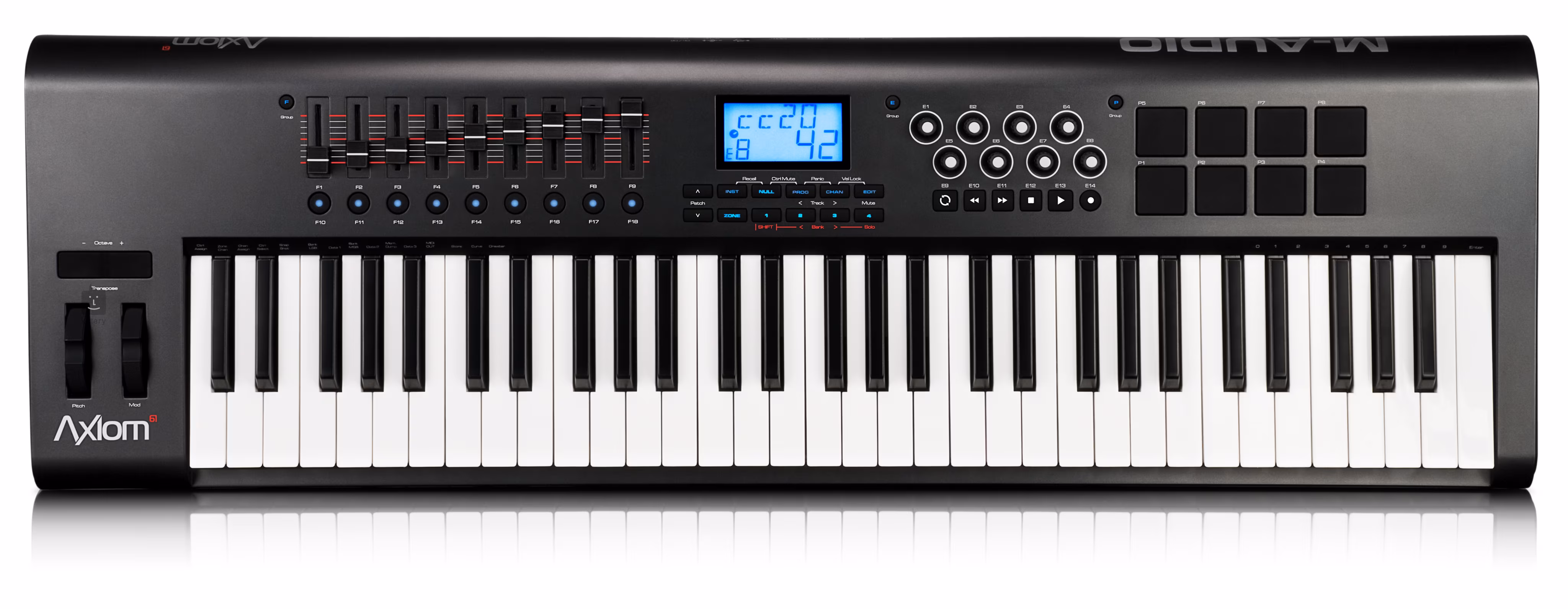 Nový M-Audio Axiom 61 MKII USB MIDI kontroler vám umožní dostat maximum z vašeho softwaru a jiných MIDI zařízení. Je to více než jen stroj pro vkladání MIDI dat. Má polovyváženou klaviaturu s Aftertouch, která uspokojí i nejnáročnejší hráče a velké dynamické trigger pady pro nahrávání bicích anebo spouštění "one shot" samplů. Otočné a posuvné ovladače a tlačítka vám umožňují v reálném čase absolutní kontrolu nad vaším softwarem a hudbou. DirectLink mode zajišťuje jednoduchý a automatický přístup k bežným DAW funkcím včetně transport, mixer, track pan a dalších virtuálních parametrů. Žádná komplikovaná nastavení. Výrazný displej a zkosený přední panel umožňují dokonalý přehled a pohodlné ovládání v jakýchkoli podmínkách.