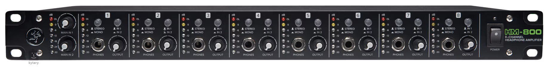 Sluchátkový zesilovač Mackie HM-800 nabízí dvojici diskrétních stereo vstupů s odděleným nastavením hlasitosti a celkem osm kanálů s dvěma sluchátkovými výstupy. K dispozici je tak celkem 16 sluchátkových výstupů, takže bez problému nahrajete třeba sbory. Na každém kanálu se nachází LED metr se sedmi stupni, aux vstup s nastavitelnou hlasitostí, přepínač vstupního kanálu a stereo/mono přepínač.