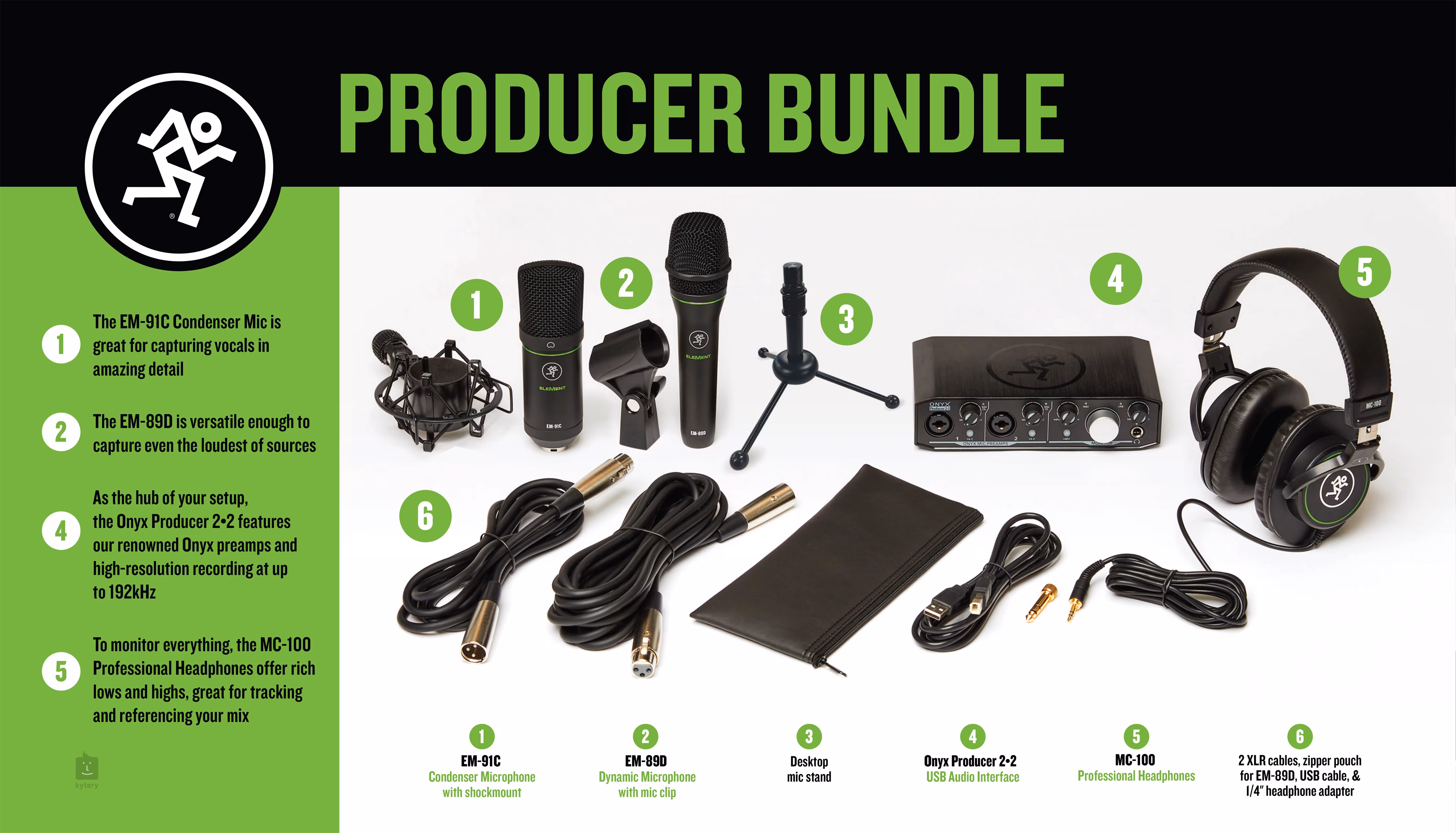 Producer Bundle je studiový set vhodný pro všechny kreativce a hudebníky, kteří by rádi předělali svůj pokoj na nahrávací studio, kde by mohli vytvářet vlastní audiovizuální materiál. Set se skládá z dynamického mikrofonu EM-89D, kondenzátorového mikrofonu EM-91C, dvoukanálové zvukové karty Onyx Producer 2x2, studiových sluchátek MC-100 a drobného příslušenství pro maximální komfort při vašem nahrávání. Všechny položky ze sestavy jsou designově sladěné, takže kromě kvalitního zvuku získáte i skvělý vizuální efekt pro vaše videa. Vše pořídíte za zlomek ceny, takže zbylé finanční prostředky můžete použít na placenou reklamu, aby se vaše videa stala co nejvíce virálními.