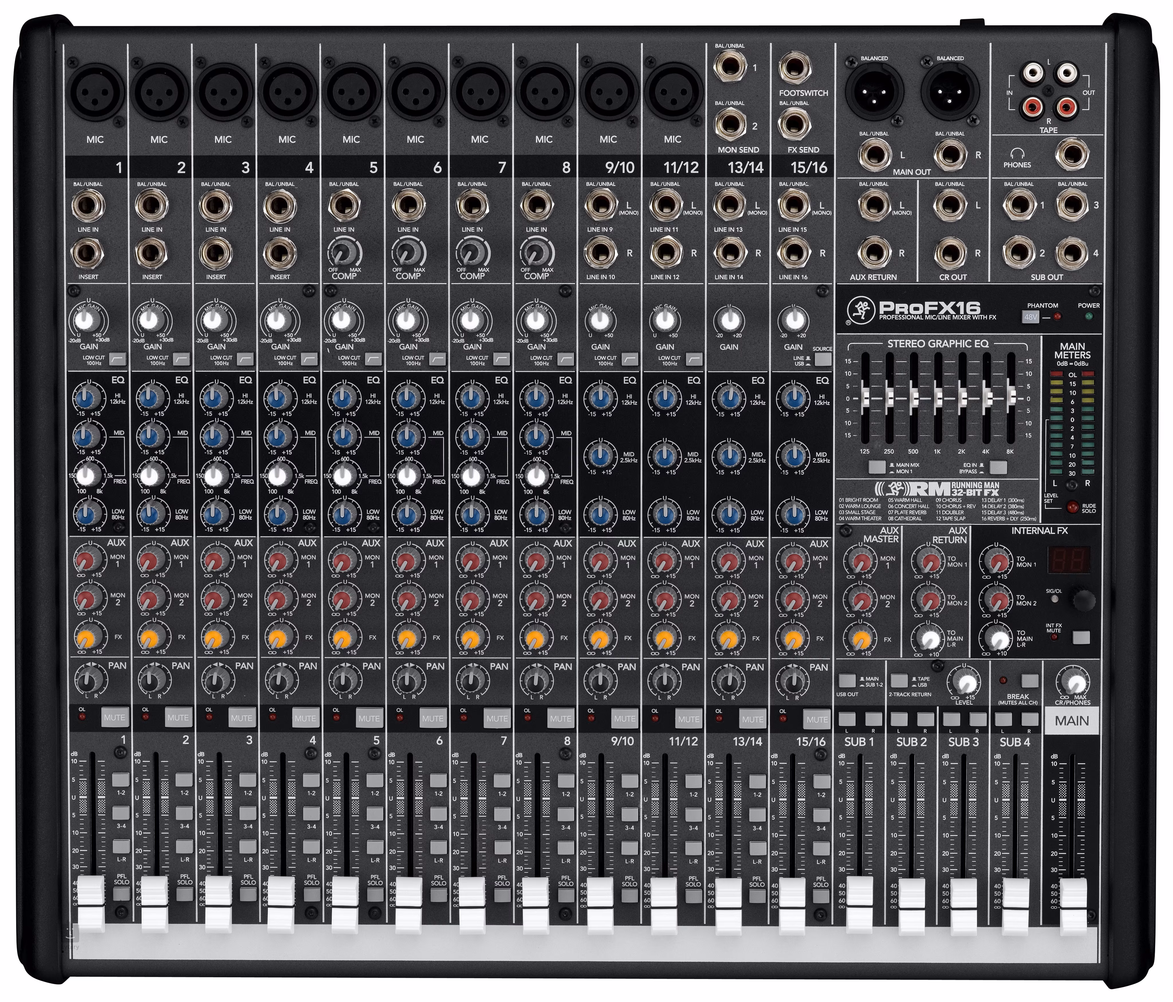 Konkrétně ProFX 16 je ideální řešení pro koncerty. Jde totiž o 16 kanálový mixpult, který na 10 kanálech nabízí nízkošumové „high-headroom“ mikrofonní předzesilovače. 4 kanály jsou plně stereo, krom toho zde naleznete i Stereo Return. Každý kanál má svůj vlastní fader a 3 pásmový ekvalizér, díky čemuž si bez problémů nastavíte všechny parametry. Mikrofonní kanály samozřejmě mají phantomové napájení a low-cut filtr na 100Hz pro odstranění nežádoucích šumů zvuků. Pro hlavní mix můžete použít 7 pásmový grafický ekvalizér.