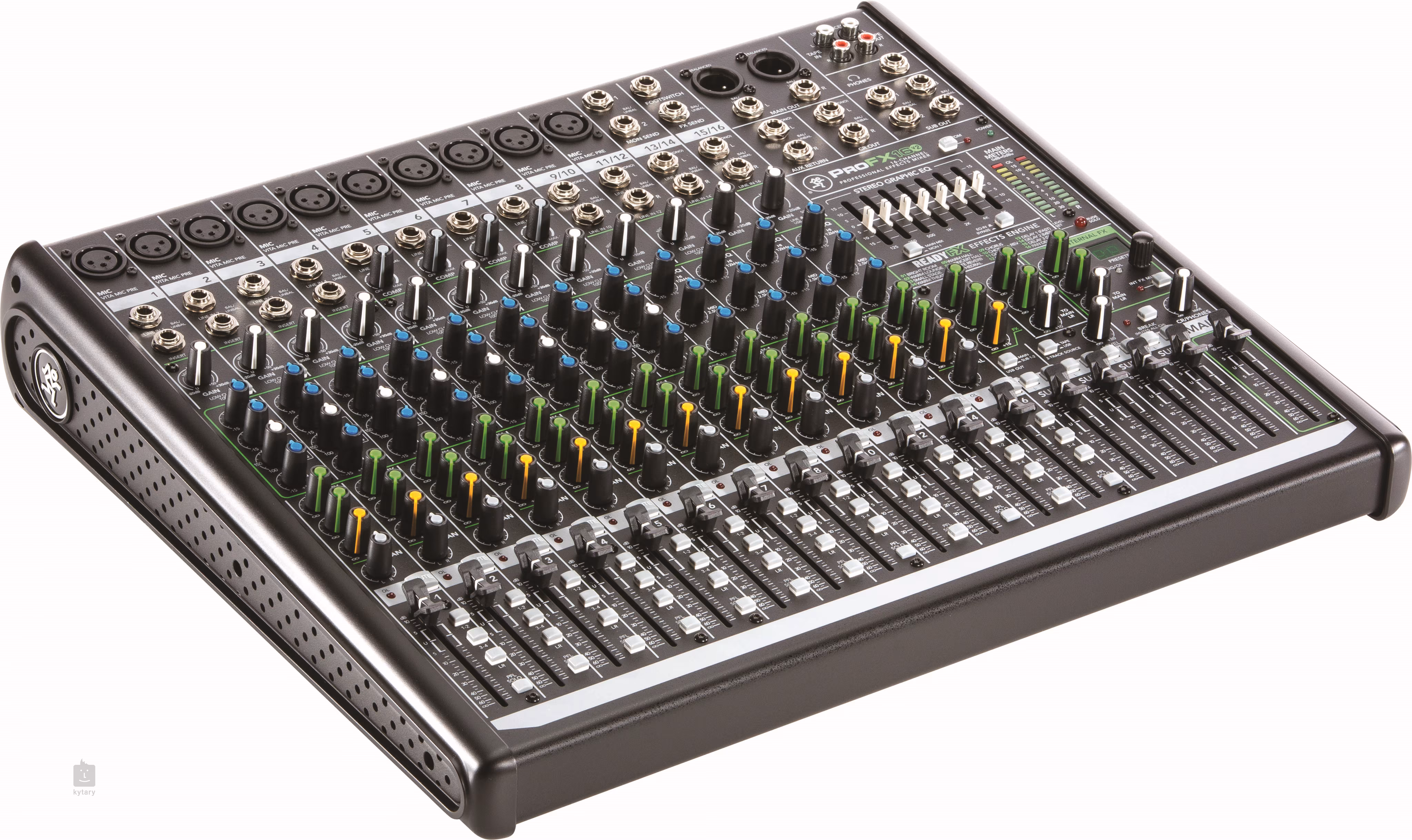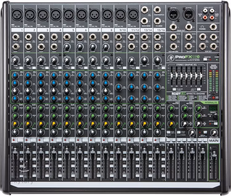 Konkrétně PROFX16V2 je 16kanálový mixážní pult s 10 Vita preampy a ReadyFX zvukovým enginem. Zvuk lze ovládat 7pásmovým grafickým ekvalizérem a 3pásmovým ekvalizérem pro každý kanál. Krom 10 XLR/Jack vstupů disponuje také Hi-Z vstupem pro přímé zapojení kytary/baskytary a dalšími jack vstupy. Dále zde najdeme stereo RCA vstup a výstup, výstup pro monitory, hlavní výstup, výstup pro sluchátka a vstup pro footswitch.