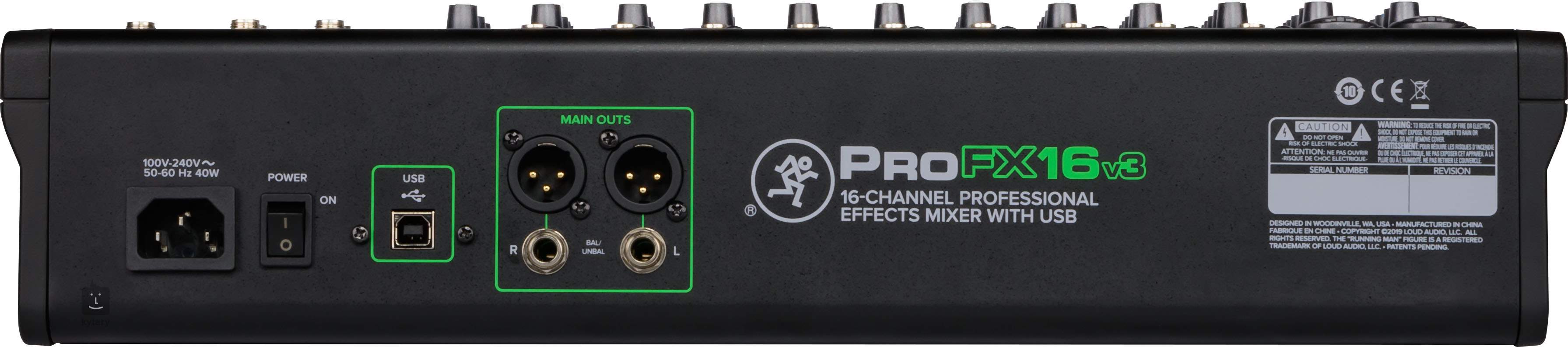Konkrétně ProFX16v3 je šestnáctikanálový mixážní pult s jedenácti Onyx preampy a GigFX zvukovým enginem. Zvuk lze nastavit pomocí intuitivních ovladačů a třípásmového ekvalizéru na každém kanálu, kromě dvou Kombi XLR/Jack vstupů disponuje pult také Hi-Z vstupem pro přímé zapojení kytary/baskytary, devíti XLR/stereo Jack vstupy a Line IN pro hudební přehrávač nebo mobilní zařízení. Dále zde najdete výstup pro monitory, hlavní výstup, výstup pro sluchátka a vstup pro footswitch.