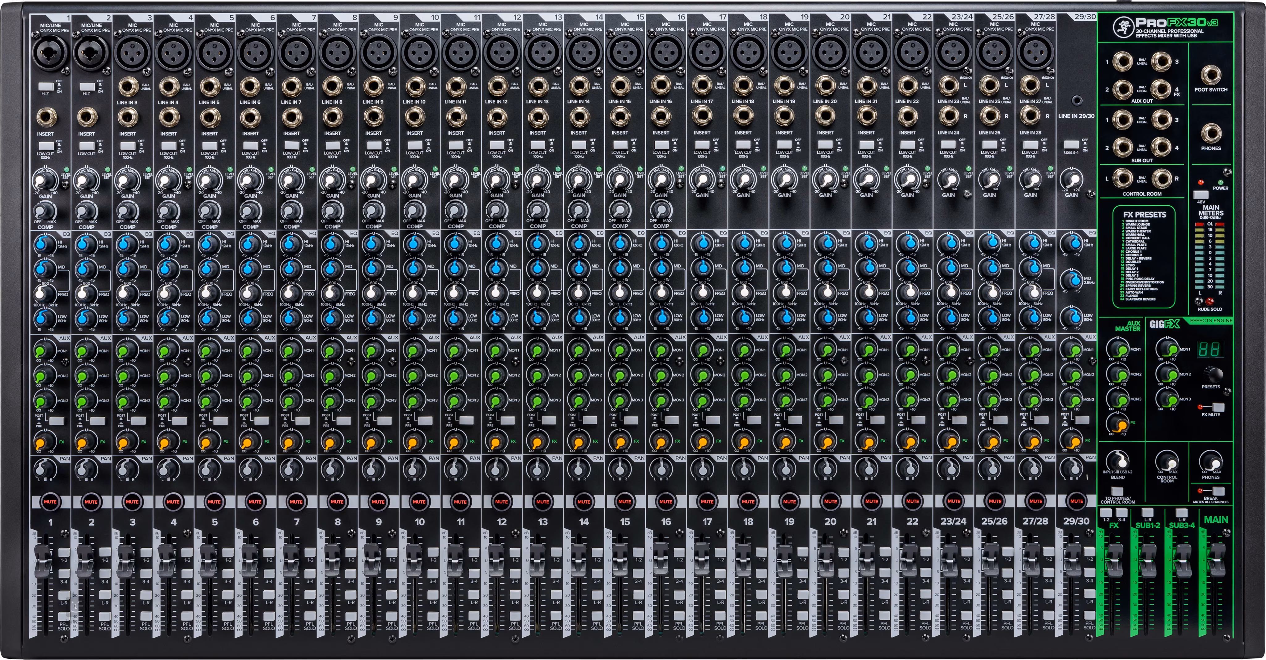 Konkrétně ProFX30v3 je třicetikanálový mixážní pult s dvacetipěti Onyx preampy a GigFX zvukovým enginem. Zvuk lze nastavit pomocí intuitivních ovladačů a třípásmového ekvalizéru na každém kanálu, kromě dvou Kombi XLR/Jack vstupů disponuje pult také Hi-Z vstupem pro přímé zapojení kytary/baskytary, třiadvaceti XLR/stereo Jack vstupy a Line IN pro hudební přehrávač nebo mobilní zařízení. Dále zde najdete výstup pro monitory, hlavní výstup, výstup pro sluchátka a vstup pro footswitch.