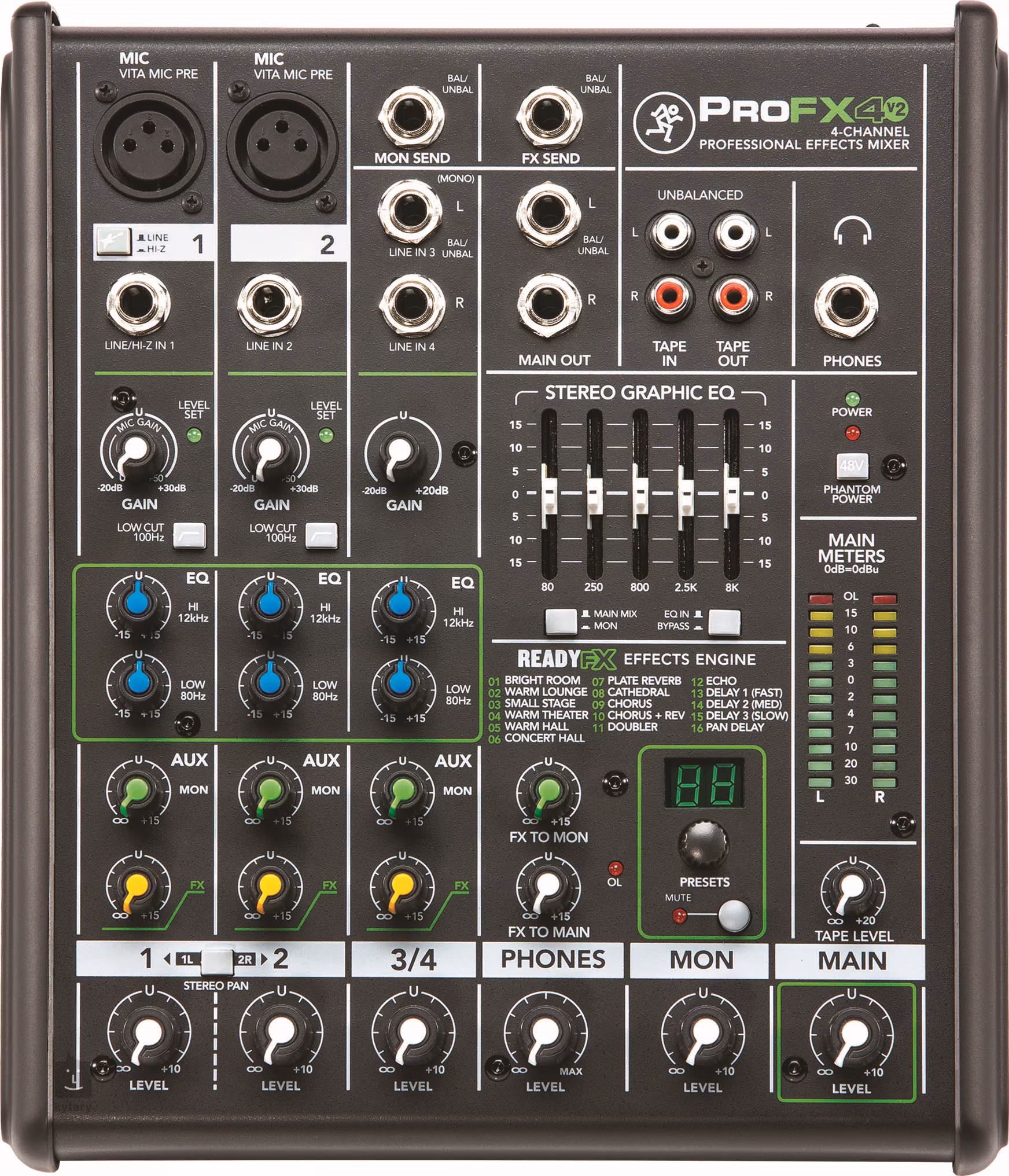 Konkrétně PROFX4V2 je 4kanálový mixážní pult s dvěma Vita preampy a ReadyFX zvukovým enginem. Zvuk lze ovládat 5pásmovým grafickým ekvalizérem a 2pásmovým ekvalizérem pro každý kanál. Krom dvou XLR vstupů disponuje také Hi-Z vstupem pro přímé zapojení kytary/baskytary a dvěma jack vstupy. Dále zde najdeme stereo RCA vstup a výstup, výstup pro monitory, hlavní výstup a výstup pro sluchátka.