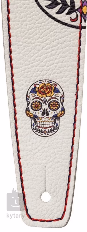Zároveň jsou vybaveny klasickým ''dírkovým'' systémem nastavení délky bez jakýchkoliv spon a kovových částí, které by mohly ohrozit lak vašeho cenného nástroje. Dírek najdete po celé délce osm, což umožňuje dokonalé přizpůsobení potřebám každého hudebníka. Popruh je vyroben ručně v Itálii a je zdobený lebkou ve stylu mexického svátku mrtvých.