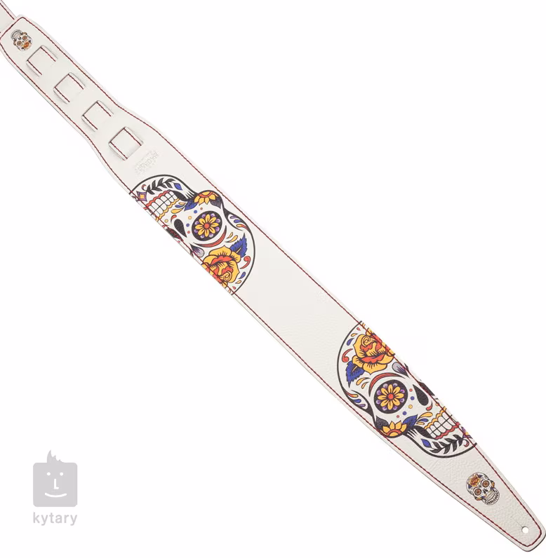 Zároveň jsou vybaveny klasickým ''dírkovým'' systémem nastavení délky bez jakýchkoliv spon a kovových částí, které by mohly ohrozit lak vašeho cenného nástroje. Dírek najdete po celé délce osm, což umožňuje dokonalé přizpůsobení potřebám každého hudebníka. Popruh je vyroben ručně v Itálii a je zdobený lebkou ve stylu mexického svátku mrtvých.