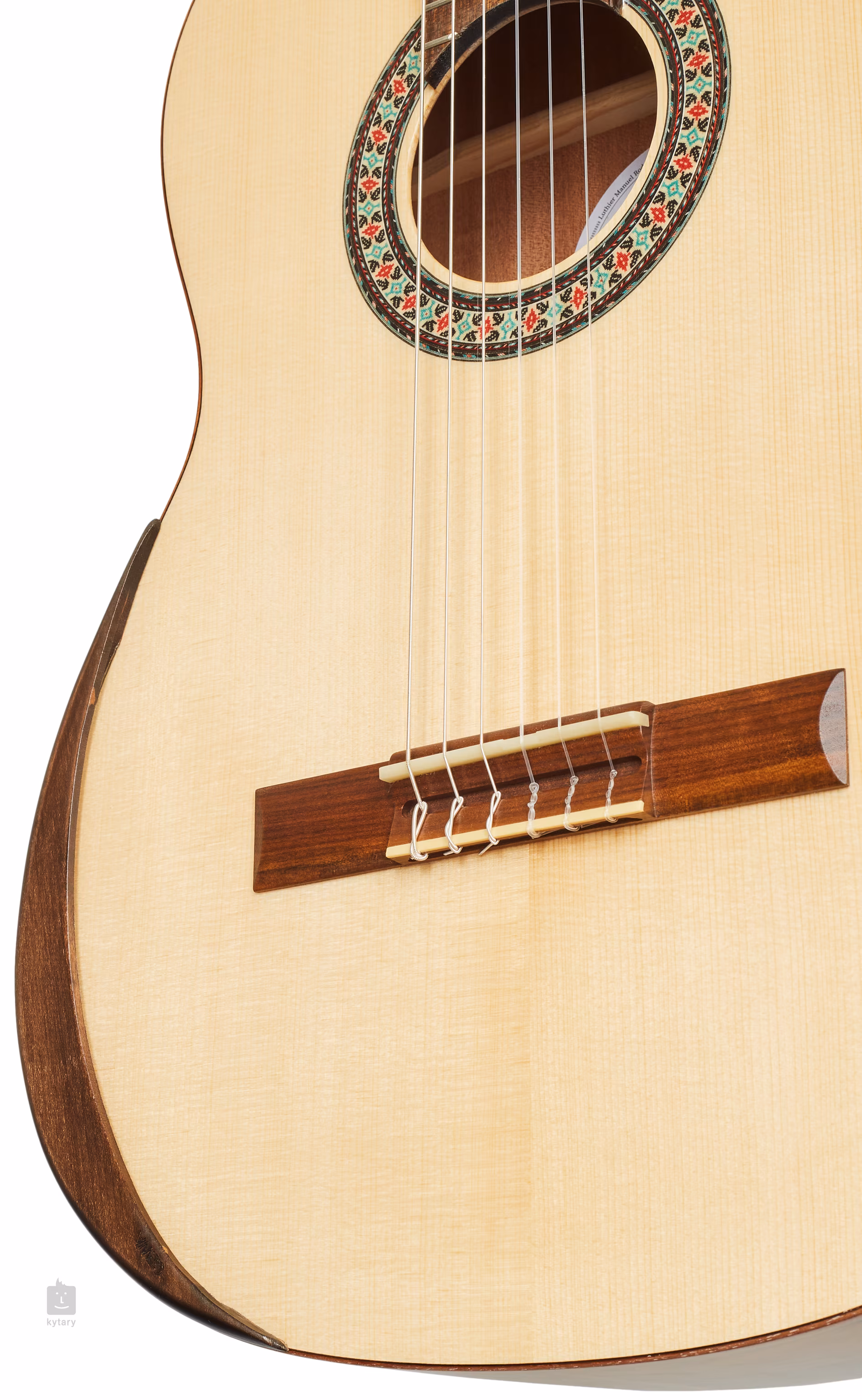 MANUEL RODRIGUEZ Exótica Series EX-SC Gloss 4/4 je klasická kytara s polomasivní konstrukcí těla. Přední deska kytary je zhotovena z masivu červeného cedru, zadní deska a luby jsou vyrobeny z překližovaného pau ferro. Top kytary zdobí mahagonová obvodová lemovka a dřevěná rozeta.