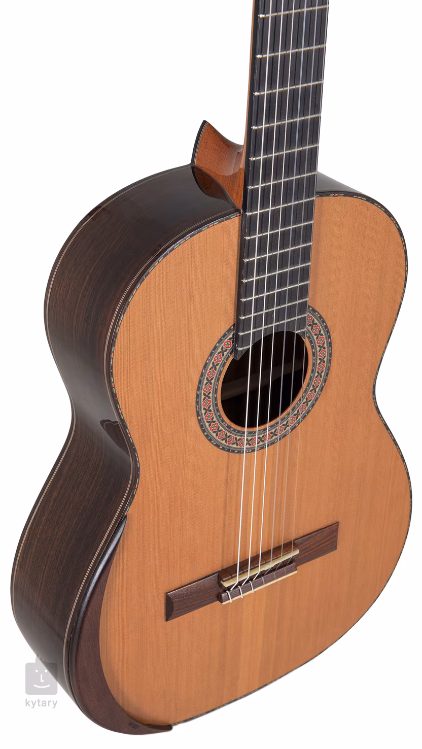 MAGISTRAL Series F ind. Palisander all solid je klasická kytara v plné 4/4 velikosti. Přední deska nástroje je zhotovena z červeného cedru, zadní deska a luby jsou vyrobeny z indického palisandru. Kytara dále nabízí cedrový krk s ebenovou výztuhou, ebenový hmatník, palisandrovou kobylku se dvanácti otvory, nultý pražec z kosti, pozlacené mechaniky s lyrou a černými kolíčky, praktickou opěrku ruky pro větší herní komfort a tradiční prvky v podobě dřevěné výložky korpusu a dekorativní rozety.