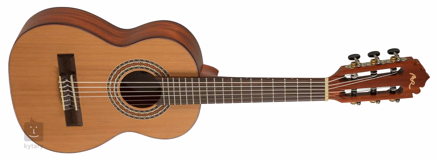 TRADICÍON Series T-44 1/4 size je dětská klasická kytara v 1/4 velikosti. Přední deska nástroje je zhotovena z masivu červeného cedru, zadní deska a luby jsou vyrobeny z laminovaného mahagonu. Kytara dále nabízí mahagonový krk, hmatník a kobylku z ovangkolu, nultý pražec a vložku do kobylky ze syntetického materiálu bonoid s vysokým podílem skla (podobný materiálu TusQ), v Nizozemsku vyrobené ladící mechaniky Van Gent s černými kolíčky a tradiční prvky v podobě javorové výložky, dekorativní rozety a mahagonové dýhy na hlavici.