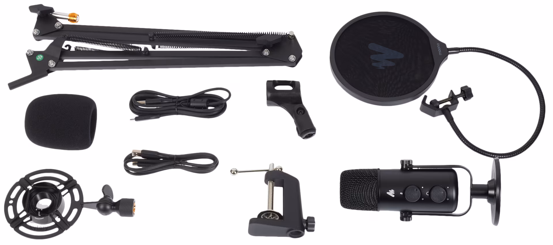 Flexibilní USB kondenzátorový mikrofon vhodný pro začínající muzikanty, hudební producenty a tvůrce podcastů, nebo vlogů. Mikrofon disponuje duální kapslí s kardioidní a kulovou směrovou charakteristikou pro krystalicky čistý záznam bez okolních ruchů a šumů. Přední panel obsahuje ovladač Gain, tlačítko Mute a Volume pro sluchátkový výstup, který vám zprostředkuje detailní monitoring. Součástí balení je mikrofonní stojan s nastavitelným ramenem a závitovou svorknou pro připevnění ke stolu, Pop filtr, mikrofonní držák a USB-C kabel pro připojení do PC či laptopu. Mikrofon je vhodný na studiové session a live perfromance.