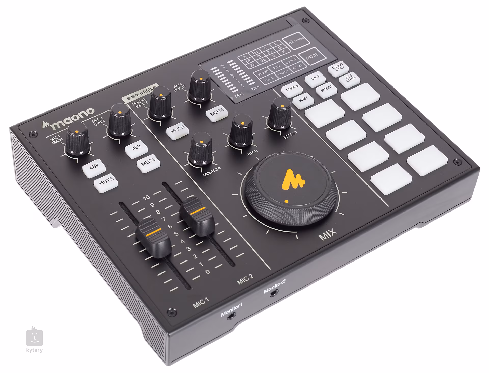 K dispozici máte osm zvukových efektů, přičemž tři z nich jsou programovatelné. Dále pak tlačítko Pitch, které dokáže váš hlas změnit například na robota nebo opačné pohlaví, robustní kolečko MIX pro úpravu zvukového signálu, a nebo Noise reduction, která zase dokáže pomocí moderních algoritmů potlačit nechtěný hluk z okolí. U livestreamů určitě oceníte například možnost Side Chain, která ztlumí zvuk hudby v pozadí a zvýrazní lidský hlas. Analogové výstupy umožní stream až do dvou zařízení najednou.