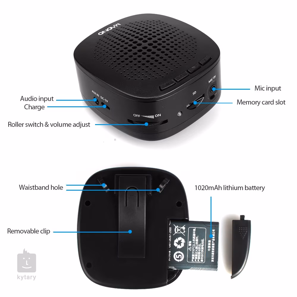 Hlavový mikrofon disponuje mikrofonní kapslí s kulovou směrovou charakteristikou, pohodlným hlavovým mostkem a flexibilním kabelem s Jack 3,5 mm konektorem. Sklon mikrofonu si potom nastavíte pomocí polohovatelné držáku mikrofonu. Přenosný reproduktor disponuje kompatkními rozměry a nízkou hmotností, baterie na jedno nabití vydrží až deset hodin provozu. Reproduktor dále obsahuje intuitivní ovládání změny hlasitosti a přepínání skladeb, jež nahrajete z vaší SD paměťové karty. Pokud vlastníte starší hudební přehrávač, můžete využít Aux vstupu. Reproduktor následně připevníte za pásek pomocí klipsny na zadní straně nebo použijete ramenní popruh (součástí balení). Součástí balení je dále USB napájecí kabel a audio kabel na připojení hudebního přehrávače.