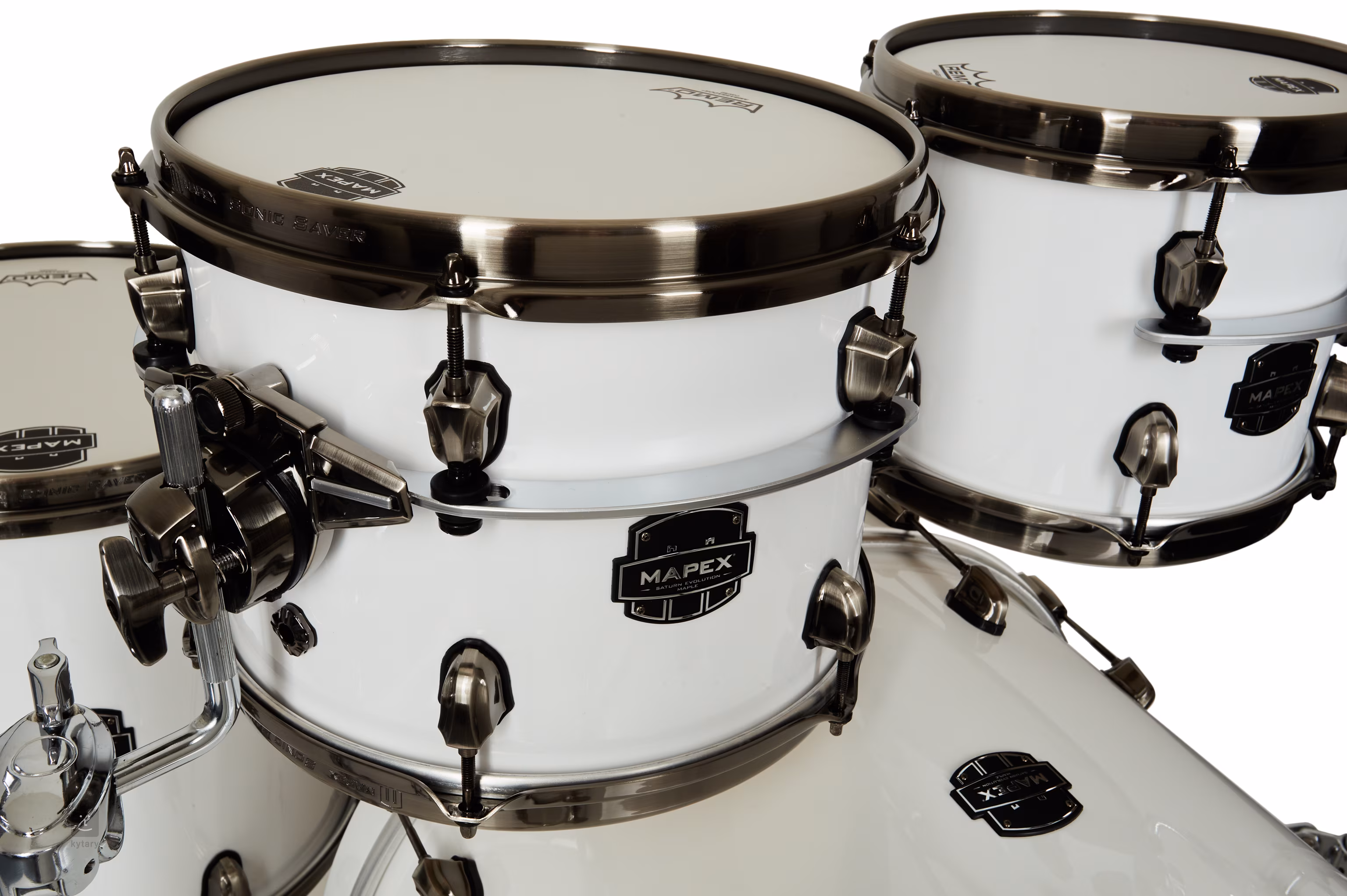 Bicí souprava Mapex Saturn Evolution Polar White Lacquer z řady Saturn Evolution Maple nabízí hybridní korpusy z 8 vrstev javoru a ořechu (javor/ořech/javor) a atenuační systém SoniClear, díky kterému je blána v lepším kontaktu s tělem bubnu a zvuk je tak přirozenější, barevnější a plnější. Uchycení tomů revolučním systémem HALO otevírá cestu k plné rezonanci a umožňuje tomům znít otevřeným čistým tónem.