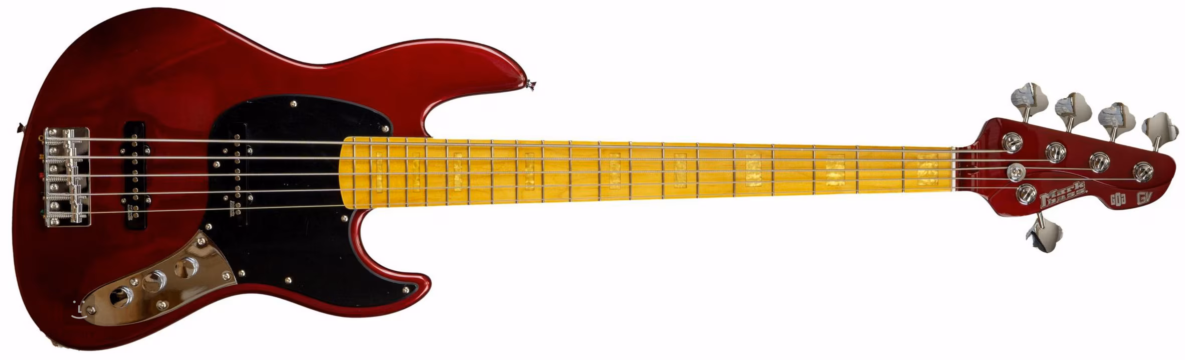 GV5 Gloxy GOG Red Passion CR MN FC je pětistrunná elektrická baskytara v JB stylu, jejíž podobu schválil špičkový umělec značky Markbass Andrew Gouchè často označovaný jako “Godfather of Gospel” bass players (proto GOG v názvu). Tělo baskytary je zhotoveno z výběrové olše. K javorovému krku je přilepen javorový hmatník osazený dvaceti pražci. Orientaci na hmatníku usnadňují polohové bloky.