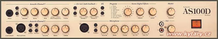 Aparát disponuje čtyřmi kanály. První je koncipován pro zapojení Vaší kytary a lze u něj ovládat Volume, Bass, Mid, Mid Frequency a Treble potenciometry plus spínače Phase a Gain – tedy přepínač fáze a switch, který zvýší vstupní úroveň. Do druhého kanálu lze připojit buď nástroj pomocí standardního 6,3 Jacku nebo mikrofon přes XLR konektor, zde umístěné ovladače jsou Volume, Bass a Middle, přiřazen je i spínač phantomového napájení, Contour pro potlačení středů, Phase obracející fázi a Link, který propojí první a druhý kanál při použití nástroje se stereo výstupem. U třetího kanálu naleznete mikrofonní XLR vstup a potenciometry Volume, Bass, Treble, Int. FX a Ext. FX, které separátně pro třetí kanál určují úroveň efektů ve smyčce a z DSP jednotky. Též jsou zde spínače Phantom a Phase. Poslední kanál má pouze stereo RCA konektor a ovladač hlasitosti.
