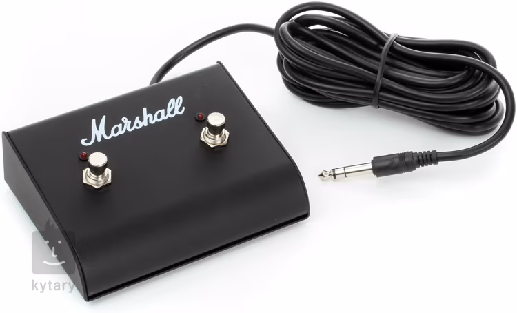 Dvoutlačítkový přepínač Marshall. Tento model s diodami je určený pro aparáty Marshall ze sérií DSL401, VS232/230, AS50, MA a Haze. Součástí balení jsou i samolepky pro označení jednotlivých spínačů.
