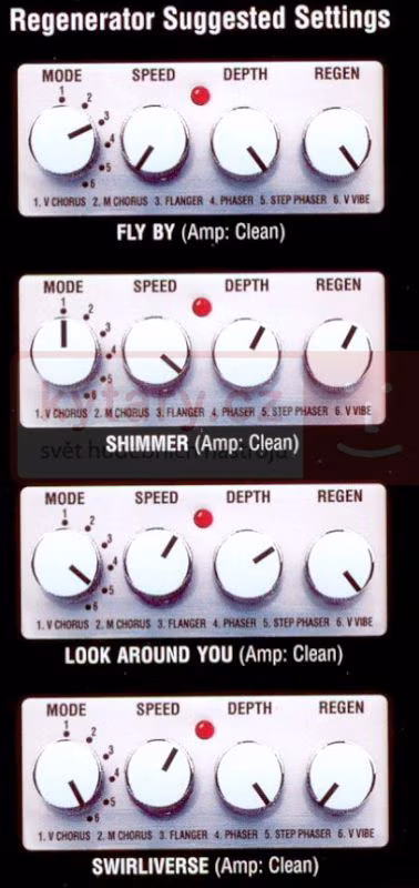 V rámci tohoto stompboxu tedy naleznete šest digitálních modulačních efektů, a to Vintage Chorus, Modern Chorus, Flanger, Phaser, Step Phaser a Vintage Vibe. Díky tomuto je Regenerator svým způsobem takovou malou továrnou na modulace.