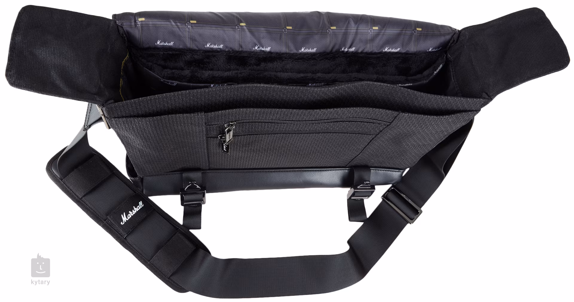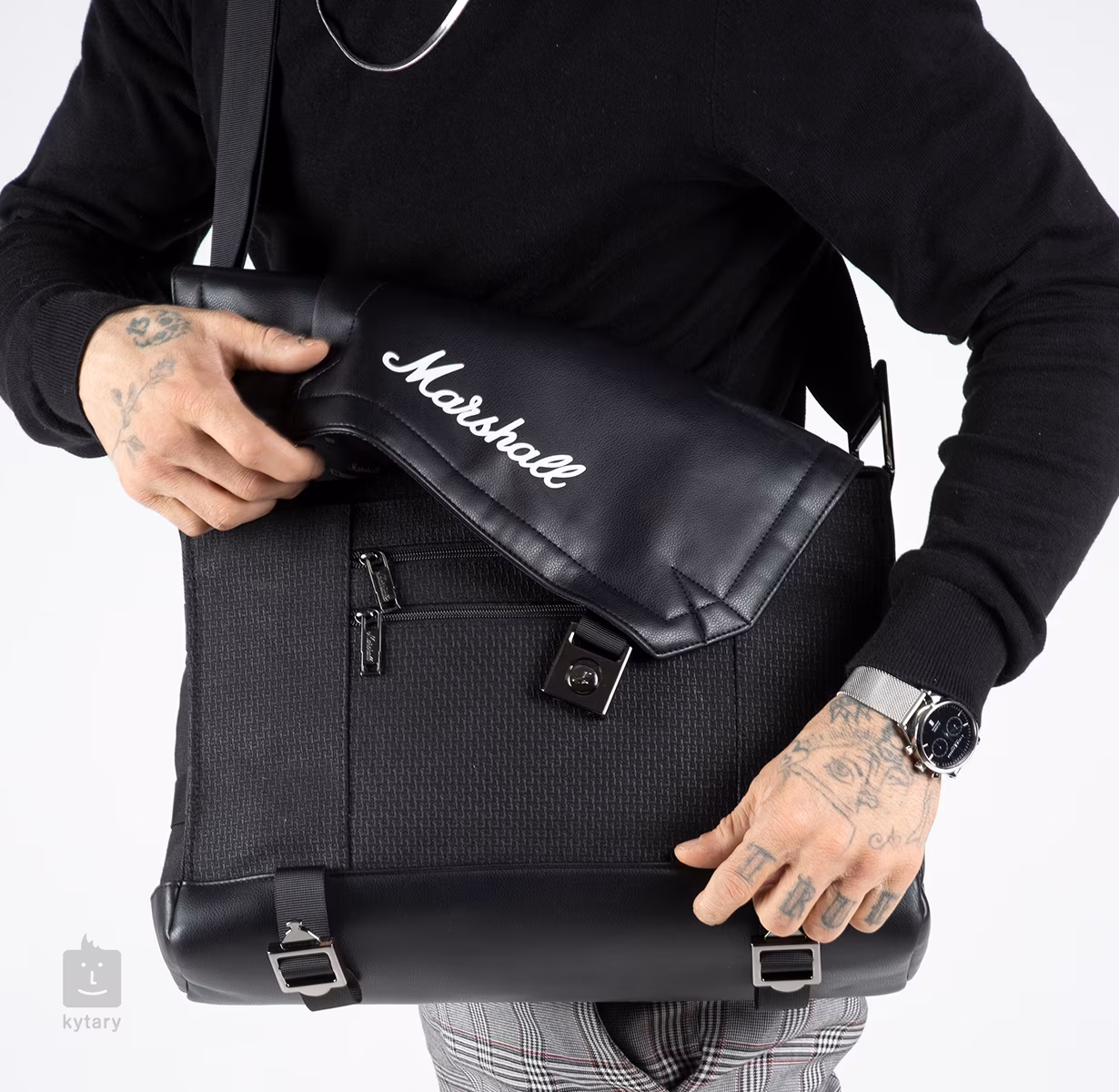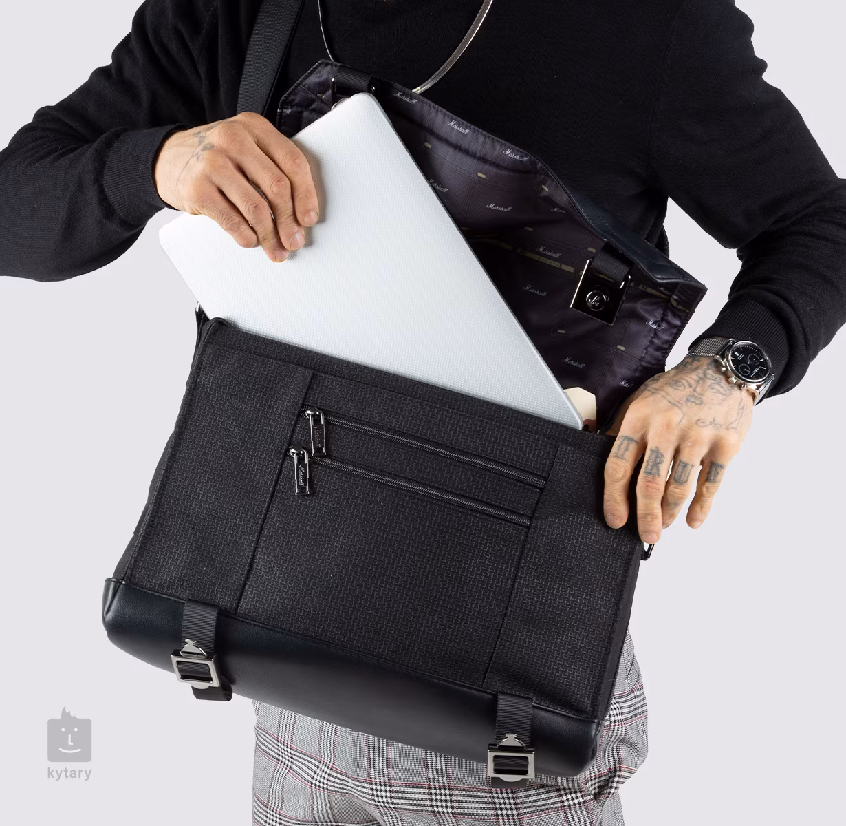 Stylová taška od legendární firmy Marshall. Je vyrobena z kombinace odolné nepromokavé textilie a veganské kůže. Vnitřní strana je vybavena prostornými přehrádkami a oddělením s plyšovou textilií pro notebook či tablet. Ramenní popruh je možné odepínat a pro maximální pohodlí na něm najdete polstrovaný polštářek. Do tašky je možné uložit tablet či notebook do velikosti 15“.