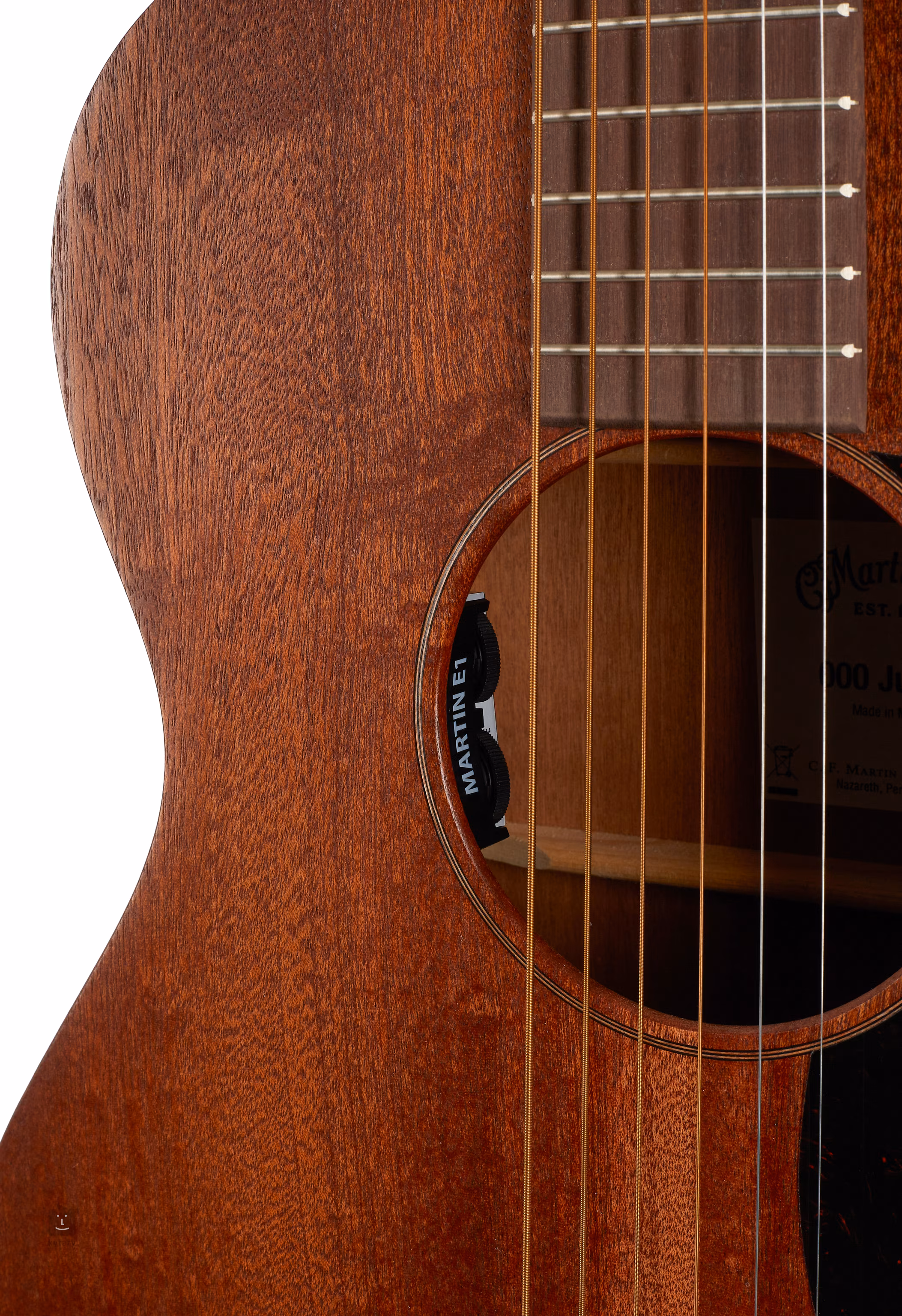 Elektroakustická kytara Martin 000 Jr-E nabízí herní pohodlí středně velkého těla „trojnulek“ a vyvážený zvuk, který oceníte při hře prstovou technikou i trsátkem. Tělo kytary je zhotoveno ze sapele, které je vlastnostmi a zvukem velmi podobné mahagonu. Dobré akustické vlastnosti kytary zvýrazňuje snížené žebrování typu X (Scalloped X-Brace) přední desky.