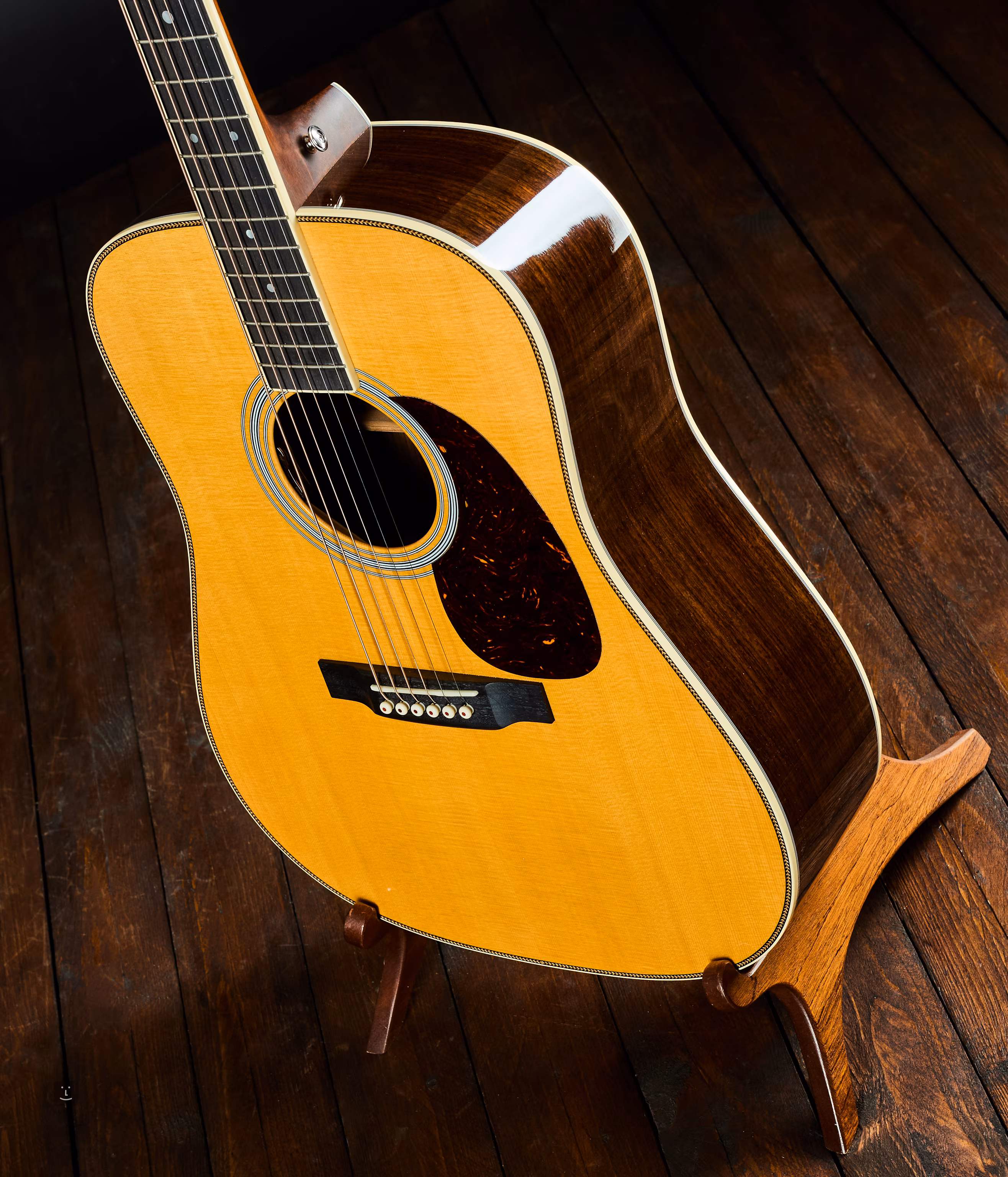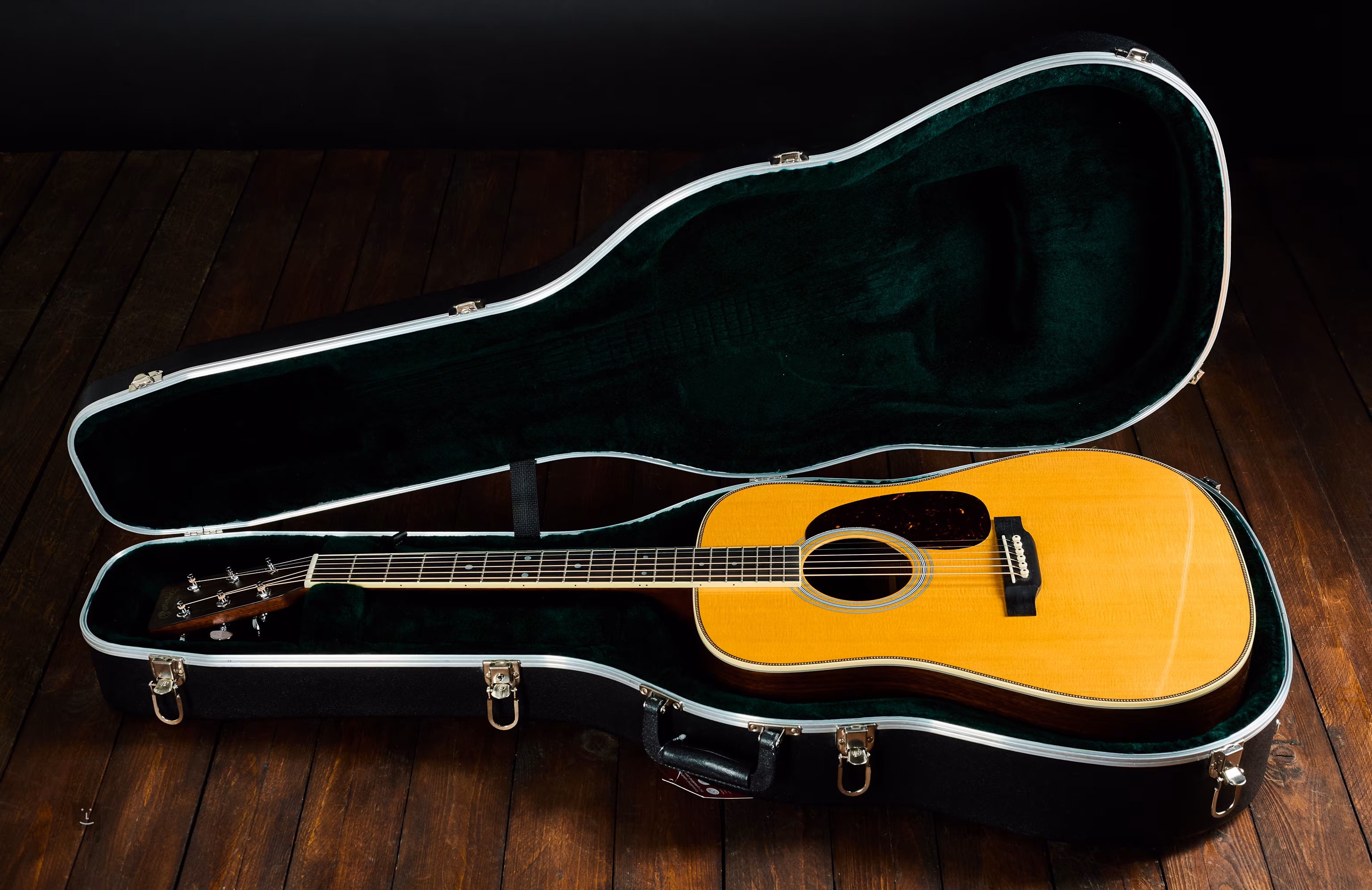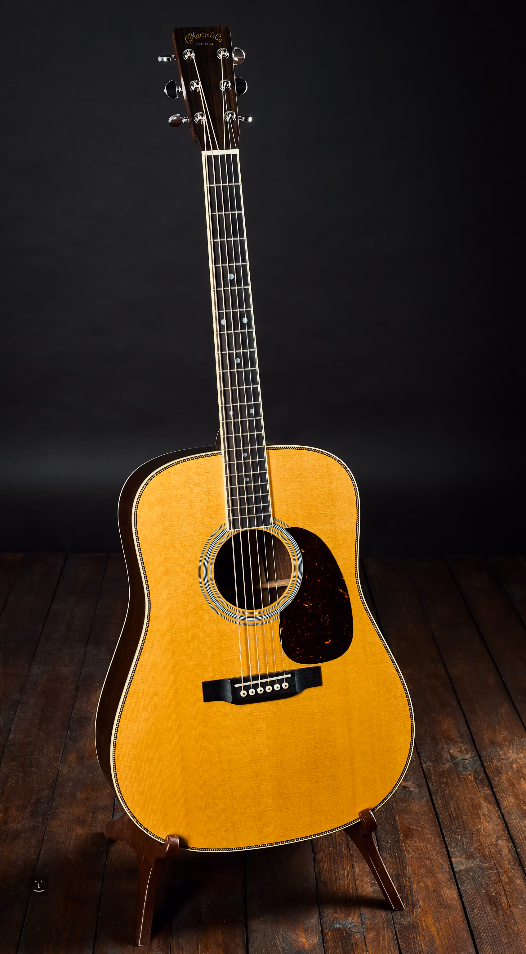 Martin HD35 z roku 2021. Lehce používaná kytara s drobnými oděrkami na zadní straně těla, jinak prakticky bez stop předchozího používání. Šetrně nainstalovaný piezo snímač L.R. Baggs zvyšuje univerzálnost této profesionální kytary.