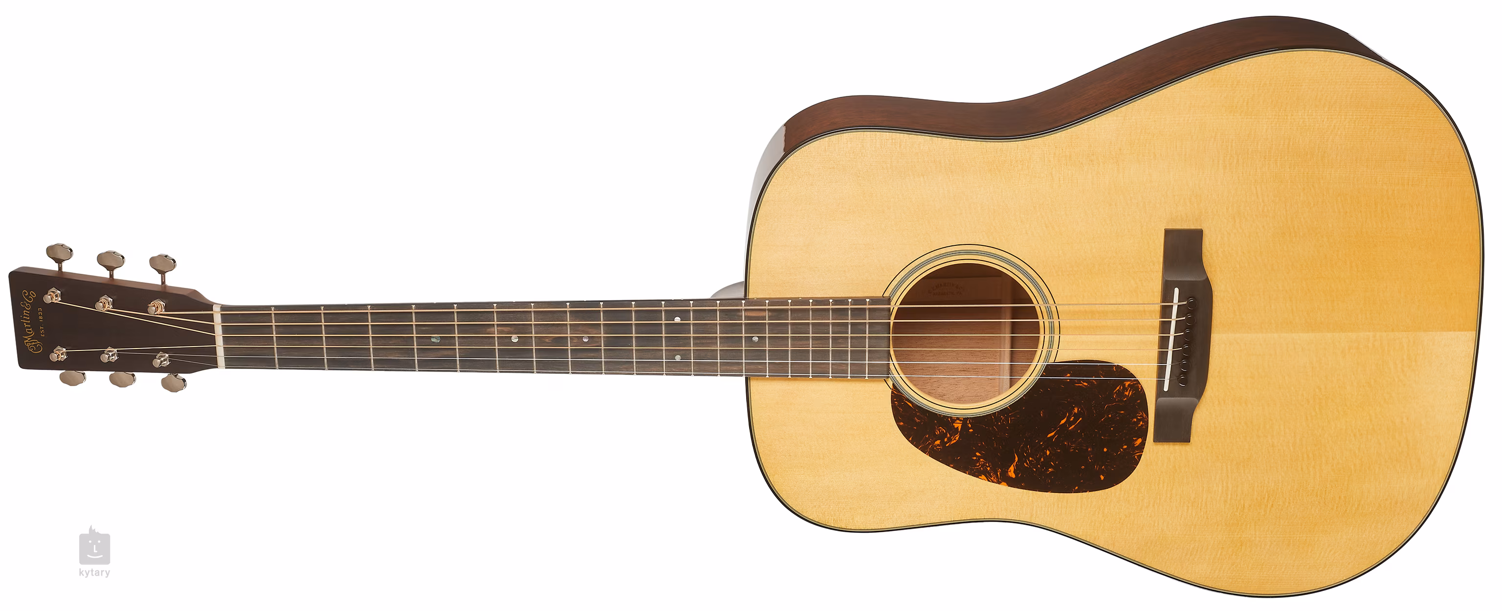 Přední deska akustické kytary D-18 Dreadnought je vyrobena ze smrku Sitka, zadní deska a luby z pravého mahagonu (dřevo stromů rodu Swietenia - honduraský, americký/kubánský či mexický mahagon). Nástroj tak disponuje menší hmotností, než poskytuje kombinace smrk/palisandr, přičemž neztrácí nic ze skvělé zvukové projekce, tónové artikulace a vyváženosti napříč frekvenčním spektrem. Žebrování typu Scalloped X se sníženými žebry ve prostředku dodává kytaře bohatý, barevný, zvuk, který se krásně prosadí ve stylech jazz/blues/folk nebo pop.