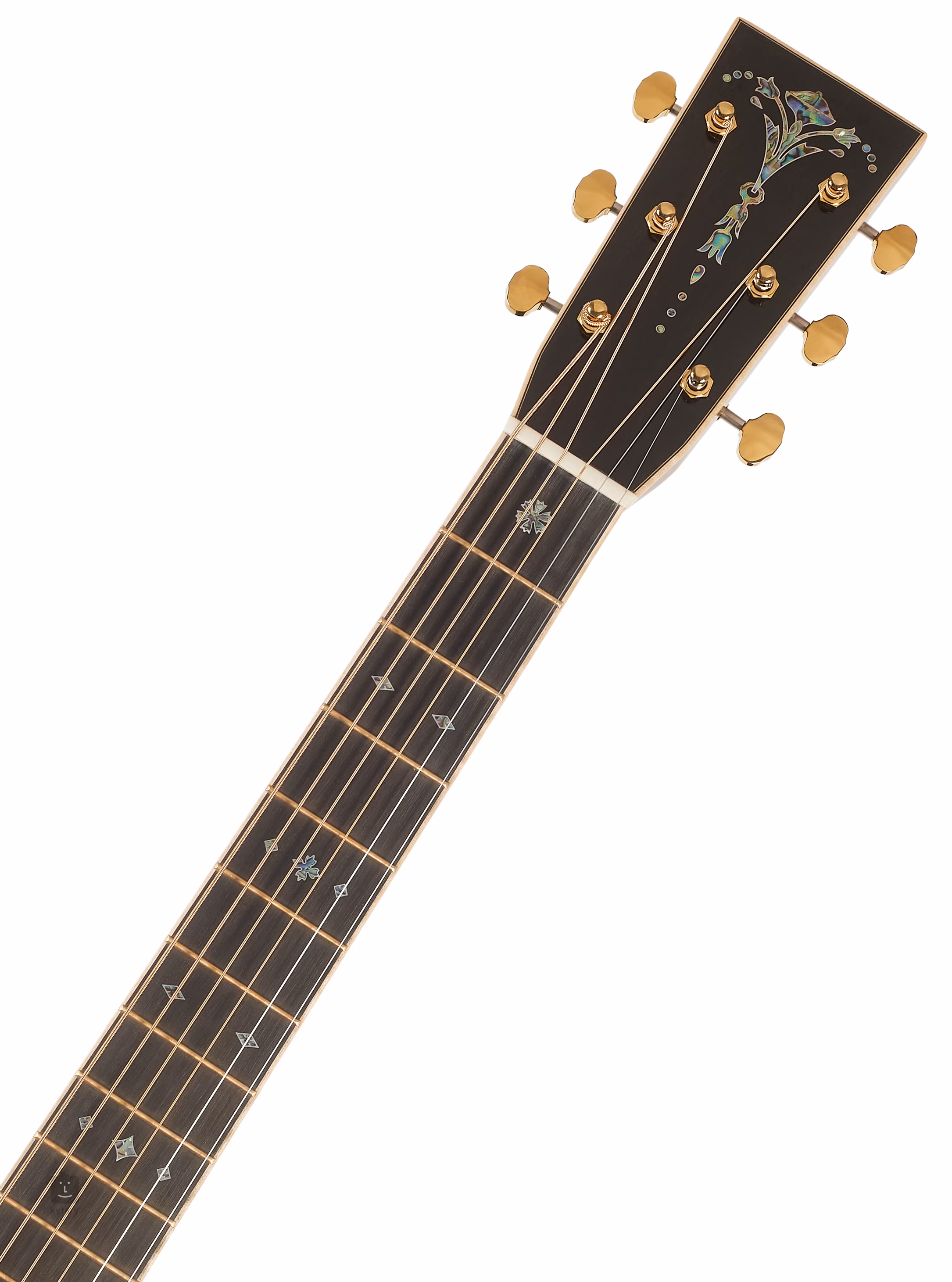 Ke krku z pravého mahagonu s profilem Vintage Deluxe je přilepen ebenový hmatník osazený dvaceti pražci v působivě zlatém provedení. Orientaci po ploše hmatníku usnadňují boční (abalone) a zdobné čelní (abalone a mother-of-pearl) perleťové polohové značky. Přesné ladění a dobrý sustain zaručuje uchycení strun přes kompenzované sedlo a nultý pražec z kosti v otevřených mechanikách ve zlatém provedení s kolíčky Butterbean a ebenové kobylce.