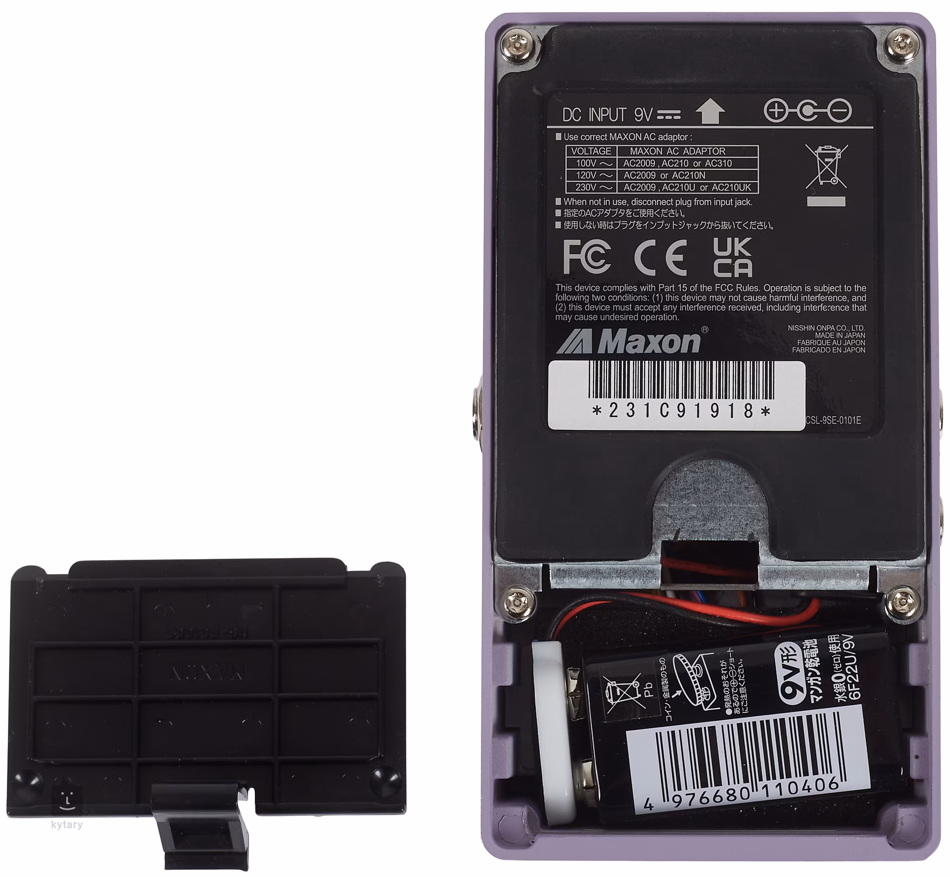 Pedál je zapojen jako true bypass. K napájení je zapotřebí 9V baterie nebo 9V adaptér.