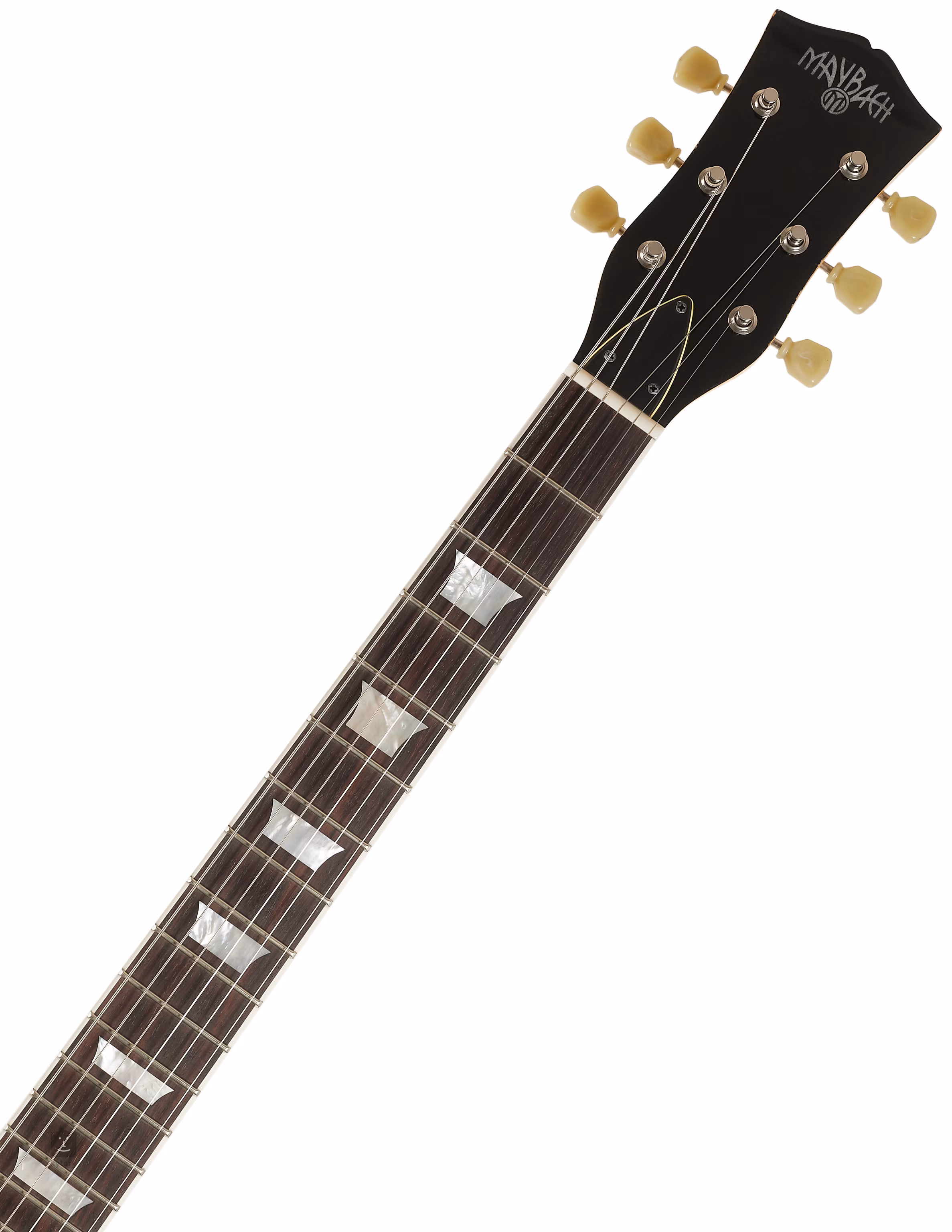 Maybach Albatroz '65-2 TV Yellow Aged je elektrická kytara v SG-style double cut designu, která nabízí veškeré klasické ingredience spojené s tímto nástrojem - lehké mahagonové tělo s plochým topem, dvěma výřezy a tvarovanými hranami, mahagonový krk a palisandrový hmatník osazený dvaadvaceti pražci velikosti Medium Jumbo.