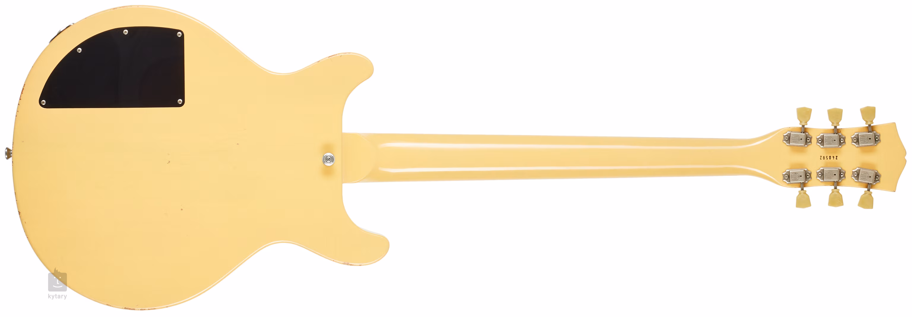 Maybach Lester Jr Double Cut Special TV Yellow Aged je elektrická kytara v double-cut designu modelů LP Junior, která nabízí veškeré klasické ingredience spojené s tímto nástrojem - mahagonové tělo, mahagonový krk a palisandrový hmatník osazený dvaadvaceti pražci velikosti Medium Jumbo.