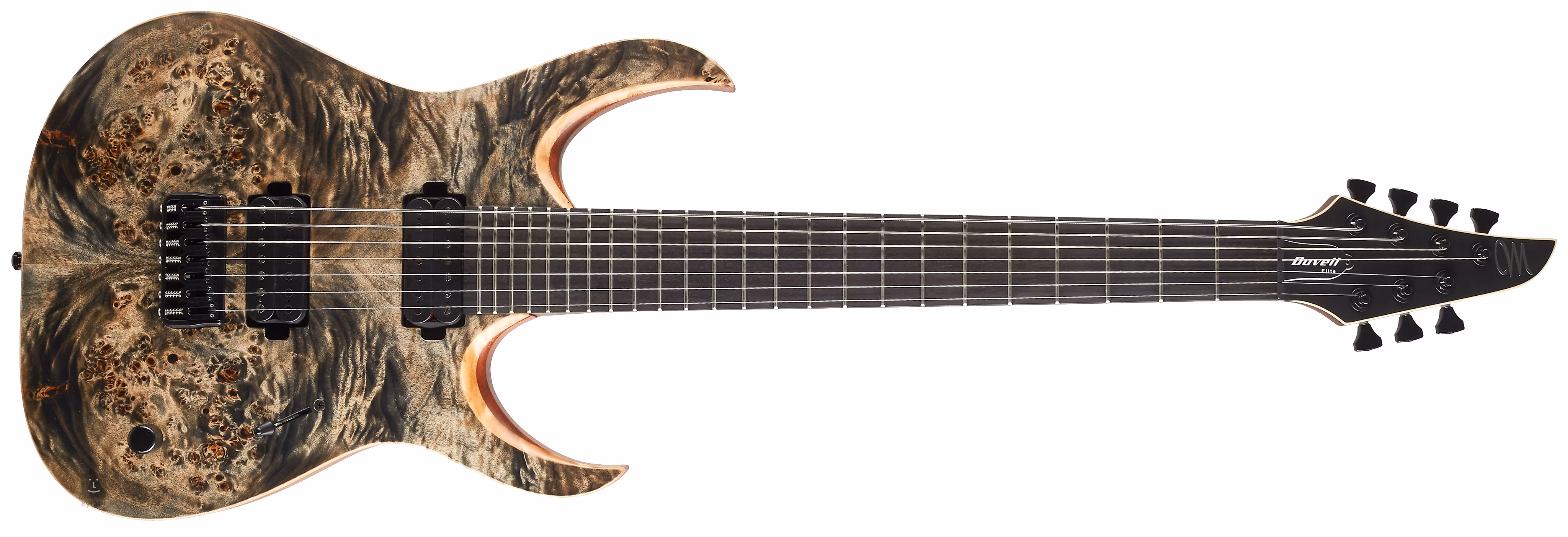 Mahagonové tělo sedmistrunného modelu Duvell Elite 7 zdobí top ze dřeva topolu (Eye Poplar) s pěknou kresbou s charakteristickými očky. K přišroubovanému krku z pěti kusů exotických dřev wenge a purpleheart/amaranth je přilepen ebenový hmatník osazený čtyřiadvaceti pražci (Wagner 9685) velikosti Extra Jumbo. Maximální pohodlí při hře zajišťuje speciálně tvarovaná patka krku pro snadný přístup na vyšší polohy hmatníku a zadní výřez těla (belly cut).